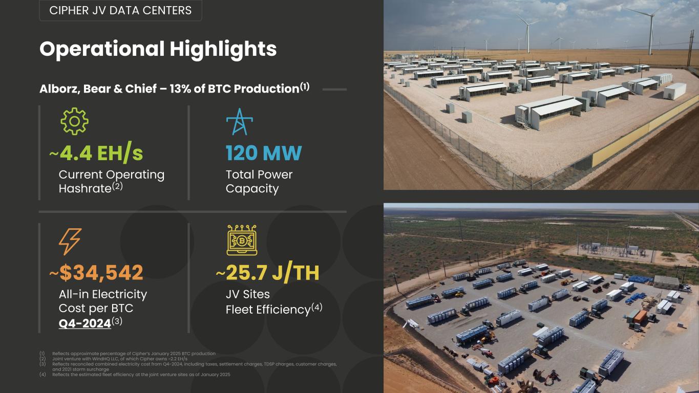 Operational Highlights CIPHER JV DATA CENTERS (1) Reflects approximate percentage of Cipher’s January 2025 BTC production (2) Joint venture with WindHQ LLC, of which Cipher owns ~2.2 EH/s (3) Reflects reconciled combined electricity cost from Q4-2024, including taxes, settlement charges, TDSP charges, customer charges, and 2021 storm surcharge (4) Reflects the estimated fleet efficiency at the joint venture sites as of January 2025 Alborz, Bear & Chief – 13% of BTC Production(1) ~$34,542 All-in Electricity Cost per BTC Q4-2024(3) ~4.4 EH/s Current Operating Hashrate(2) Total Power Capacity JV Sites Fleet Efficiency(4) ~25.7 J/TH 120 MW