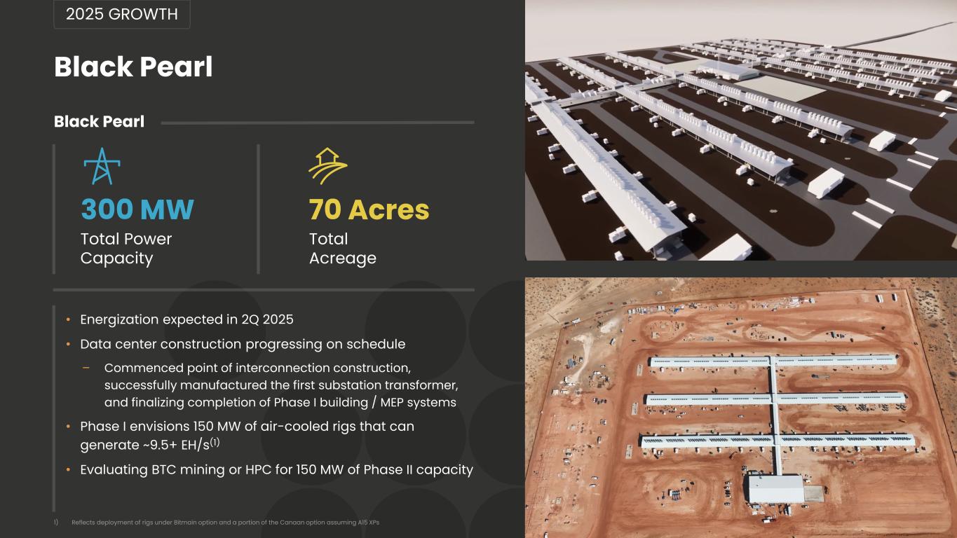Black Pearl Black Pearl 2025 GROWTH • Energization expected in 2Q 2025 • Data center construction progressing on schedule – Commenced point of interconnection construction, successfully manufactured the first substation transformer, and finalizing completion of Phase I building / MEP systems • Phase I envisions 150 MW of air-cooled rigs that can generate ~9.5+ EH/s(1) • Evaluating BTC mining or HPC for 150 MW of Phase II capacity 1) Reflects deployment of rigs under Bitmain option and a portion of the Canaan option assuming A15 XPs 300 MW Total Power Capacity 70 Acres Total Acreage