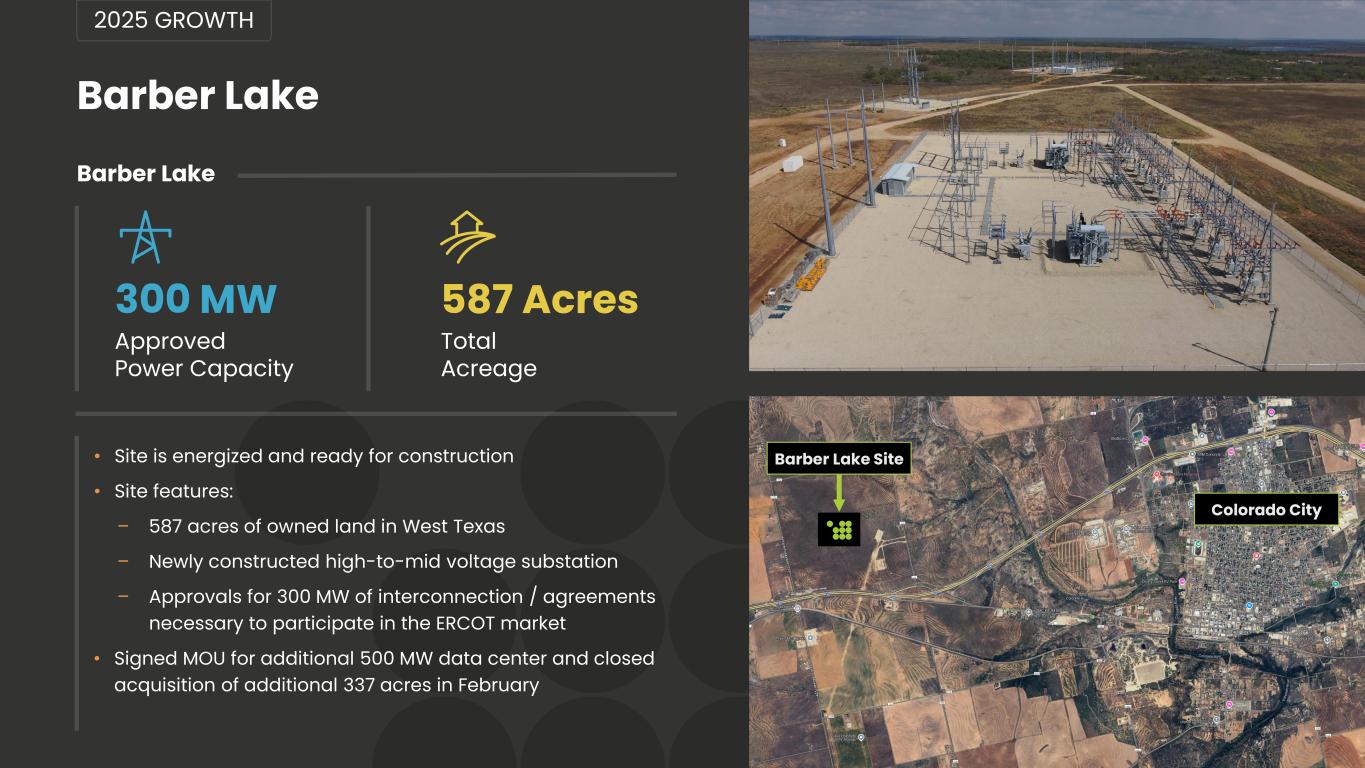 13 Barber Lake 2025 GROWTH Barber Lake 300 MW Approved Power Capacity 587 Acres Total Acreage • Site is energized and ready for construction • Site features: – 587 acres of owned land in West Texas – Newly constructed high-to-mid voltage substation – Approvals for 300 MW of interconnection / agreements necessary to participate in the ERCOT market • Signed MOU for additional 500 MW data center and closed acquisition of additional 337 acres in February Barber Lake Site Colorado City