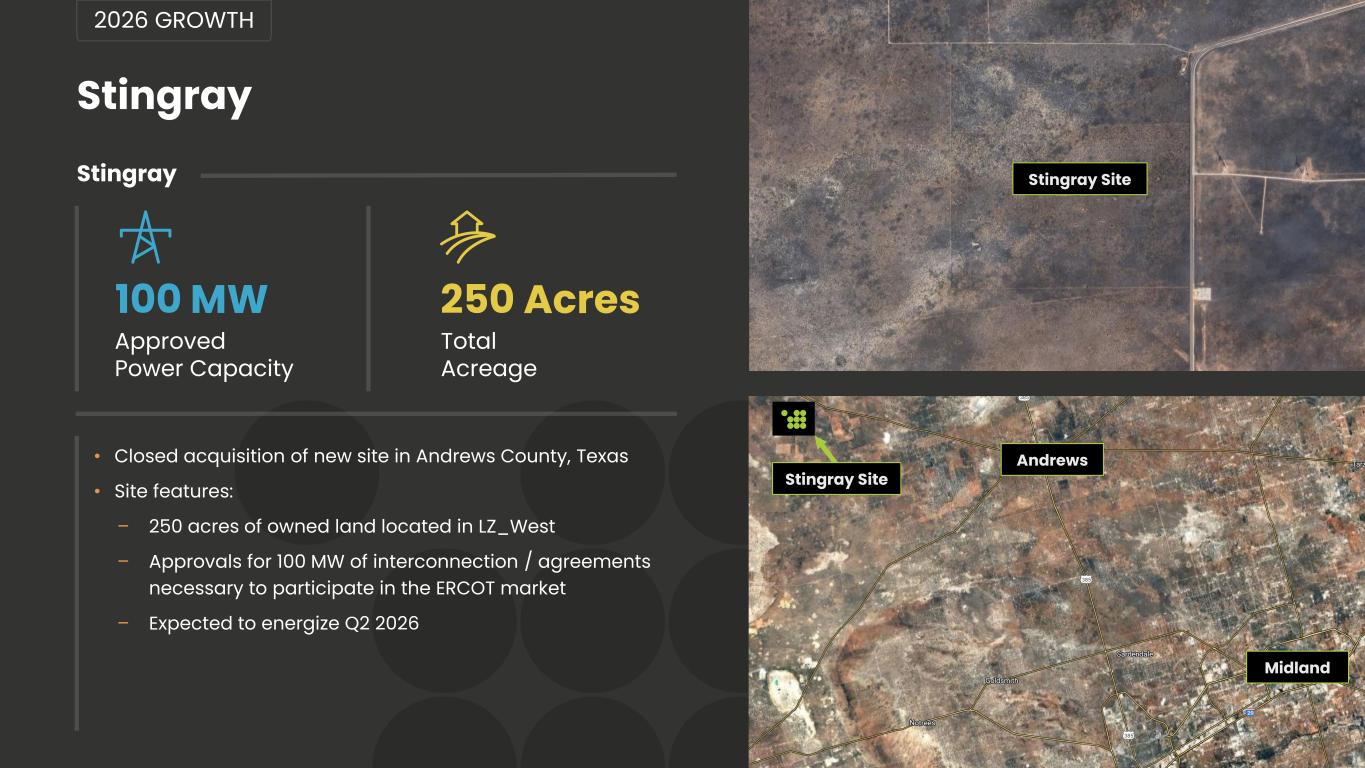 Stingray 2026 GROWTH Stingray 100 MW Approved Power Capacity 250 Acres Total Acreage • Closed acquisition of new site in Andrews County, Texas • Site features: – 250 acres of owned land located in LZ_West – Approvals for 100 MW of interconnection / agreements necessary to participate in the ERCOT market – Expected to energize Q2 2026 14 Stingray Site Andrews Stingray Site Midland
