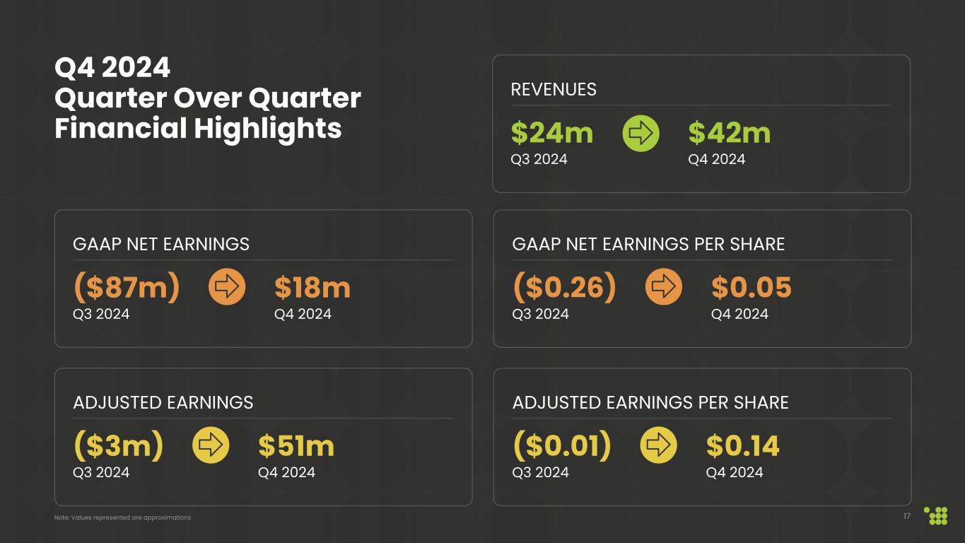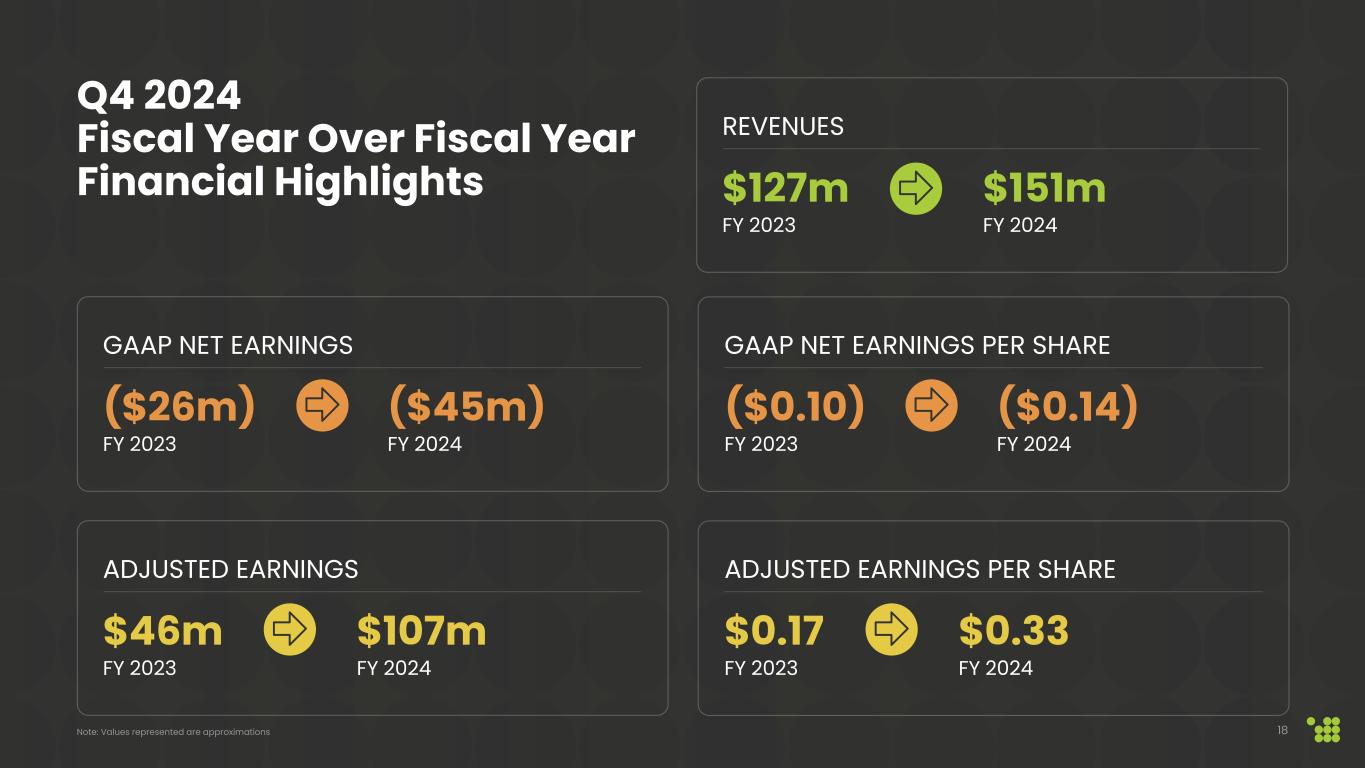 ($87m) Q3 2024 $18m Q4 2024 GAAP NET EARNINGS ($0.26) Q3 2024 $0.05 Q4 2024 GAAP NET EARNINGS PER SHARE $24m Q3 2024 $42m Q4 2024 REVENUES Q4 2024 Quarter Over Quarter Financial Highlights 17Note: Values represented are approximations ($3m) Q3 2024 $51m Q4 2024 ADJUSTED EARNINGS ($0.01) Q3 2024 $0.14 Q4 2024 ADJUSTED EARNINGS PER SHARE