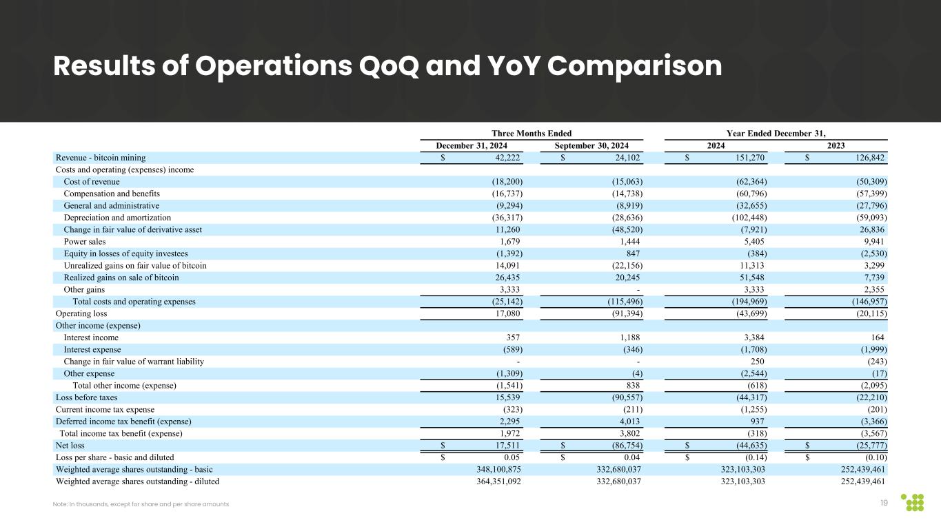 Three Months Ended Year Ended December 31, December 31, 2024 September 30, 2024 2024 2023 Revenue - bitcoin mining $ 42,222 $ 24,102 $ 151,270 $ 126,842 Costs and operating (expenses) income Cost of revenue (18,200) (15,063) (62,364) (50,309) Compensation and benefits (16,737) (14,738) (60,796) (57,399) General and administrative (9,294) (8,919) (32,655) (27,796) Depreciation and amortization (36,317) (28,636) (102,448) (59,093) Change in fair value of derivative asset 11,260 (48,520) (7,921) 26,836 Power sales 1,679 1,444 5,405 9,941 Equity in losses of equity investees (1,392) 847 (384) (2,530) Unrealized gains on fair value of bitcoin 14,091 (22,156) 11,313 3,299 Realized gains on sale of bitcoin 26,435 20,245 51,548 7,739 Other gains 3,333 - 3,333 2,355 Total costs and operating expenses (25,142) (115,496) (194,969) (146,957) Operating loss 17,080 (91,394) (43,699) (20,115) Other income (expense) Interest income 357 1,188 3,384 164 Interest expense (589) (346) (1,708) (1,999) Change in fair value of warrant liability - - 250 (243) Other expense (1,309) (4) (2,544) (17) Total other income (expense) (1,541) 838 (618) (2,095) Loss before taxes 15,539 (90,557) (44,317) (22,210) Current income tax expense (323) (211) (1,255) (201) Deferred income tax benefit (expense) 2,295 4,013 937 (3,366) Total income tax benefit (expense) 1,972 3,802 (318) (3,567) Net loss $ 17,511 $ (86,754) $ (44,635) $ (25,777) Loss per share - basic and diluted $ 0.05 $ 0.04 $ (0.14) $ (0.10) Weighted average shares outstanding - basic 348,100,875 332,680,037 323,103,303 252,439,461 Weighted average shares outstanding - diluted 364,351,092 332,680,037 323,103,303 252,439,461 Results of Operations QoQ and YoY Comparison 19Note: In thousands, except for share and per share amounts