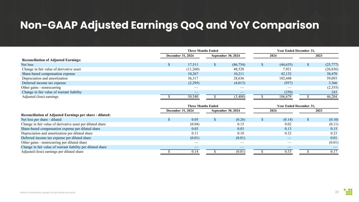 Three Months Ended Year Ended December 31, December 31, 2024 September 30, 2024 2024 2023 Reconciliation of Adjusted Earnings: Net loss $ 17,511 $ (86,754) $ (44,635) $ (25,777) Change in fair value of derivative asset (11,260) 48,520 7,921 (26,836) Share-based compensation expense 10,267 10,211 42,132 38,470 Depreciation and amortization 36,317 28,636 102,448 59,093 Deferred income tax expense (2,295) (4,013) (937) 3,366 Other gains - nonrecurring — — — (2,355) Change in fair value of warrant liability — — (250) 243 Adjusted (loss) earnings $ 50,540 $ (3,400) $ 106,679 $ 46,204 Three Months Ended Year Ended December 31, December 31, 2024 September 30, 2024 2024 2023 Reconciliation of Adjusted Earnings per share - diluted: Net loss per share - diluted $ 0.05 $ (0.26) $ (0.14) $ (0.10) Change in fair value of derivative asset per diluted share (0.04) 0.15 0.02 (0.11) Share-based compensation expense per diluted share 0.03 0.03 0.13 0.15 Depreciation and amortization per diluted share 0.11 0.10 0.32 0.23 Deferred income tax expense per diluted share (0.01) (0.01) — 0.01 Other gains - nonrecurring per diluted share — — — (0.01) Change in fair value of warrant liability per diluted share — — — — Adjusted (loss) earnings per diluted share $ 0.14 $ (0.01) $ 0.33 $ 0.17 Non-GAAP Adjusted Earnings QoQ and YoY Comparison 20Note: In thousands, except for per share amounts