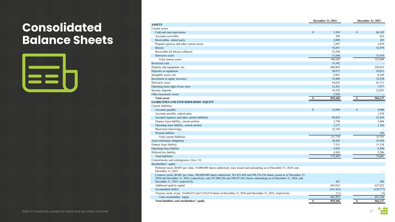 December 31, 2024 December 31, 2023 ASSETS Current assets Cash and cash equivalents $ 5,585 $ 86,105 Accounts receivable 596 622 Receivables, related party 2,090 245 Prepaid expenses and other current assets 3,387 3,670 Bitcoin 92,651 32,978 Receivable for bitcoin collateral 32,248 - Derivative asset 31,648 31,878 Total current assets 168,205 155,498 Restricted cash 14,392 - Property and equipment, net 480,865 243,815 Deposits on equipment 38,872 30,812 Intangible assets, net 8,881 8,109 Investment in equity investees 53,908 35,258 Derivative asset 54,022 61,713 Operating lease right-of-use asset 12,561 7,077 Security deposits 19,782 23,855 Other noncurrent assets 3,958 - Total assets $ 855,446 $ 566,137 LIABILITIES AND STOCKHOLDERS’ EQUITY Current liabilities Accounts payable $ 22,699 $ 4,980 Accounts payable, related party - 1,554 Accrued expenses and other current liabilities 69,824 22,439 Finance lease liability, current portion 3,798 3,404 Operating lease liability, current portion 3,127 1,166 Short-term borrowings 32,330 - Warrant liability - 250 Total current liabilities 131,778 33,793 Asset retirement obligations 20,282 18,394 Finance lease liability 7,331 11,128 Operating lease liability 9,833 6,280 Deferred tax liability 4,269 5,206 Total liabilities 173,493 74,801 Commitments and contingencies (Note 13) Stockholders’ equity Preferred stock, $0.001 par value; 10,000,000 shares authorized, none issued and outstanding as of December 31, 2024, and December 31, 2023 - - Common stock, $0.001 par value, 500,000,000 shares authorized, 361,432,449 and 296,276,536 shares issued as of December 31, 2024 and December 31, 2023, respectively, and 347,800,186 and 290,957,862 shares outstanding as of December 31, 2024, and December 31, 2023, respectively 361 296 Additional paid-in capital 863,015 627,822 Accumulated deficit (181,412) (136,777) Treasury stock, at par, 10,648,632 and 5,318,674 shares at December 31, 2024 and December 31, 2023, respectively (11) (5) Total stockholders’ equity 681,953 491,336 Total liabilities and stockholders’ equity $ 855,446 $ 566,137 Consolidated Balance Sheets 21Note: In thousands, except for share and per share amounts