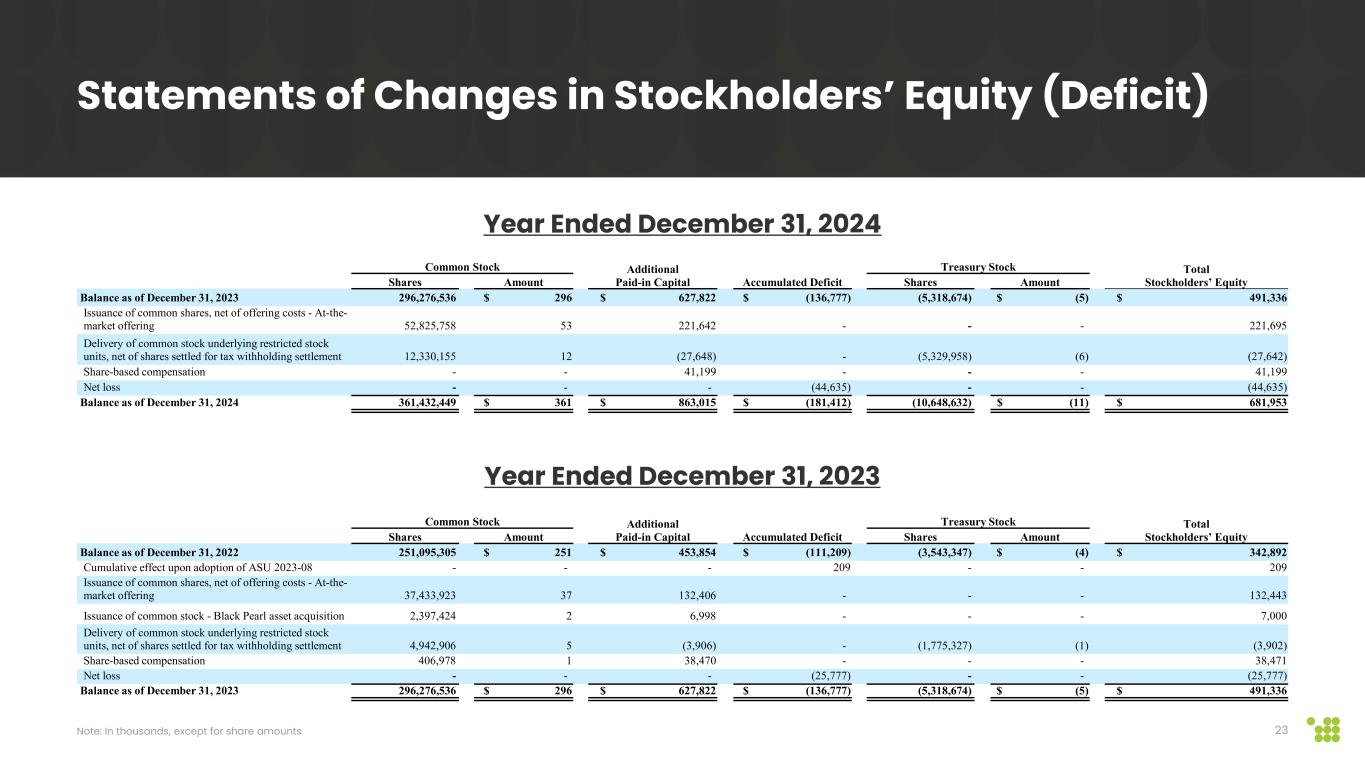 Common Stock Additional Paid-in Capital Accumulated Deficit Treasury Stock Total Stockholders’ Equity Shares Amount Shares Amount Balance as of December 31, 2022 251,095,305 $ 251 $ 453,854 $ (111,209) (3,543,347) $ (4) $ 342,892 Cumulative effect upon adoption of ASU 2023-08 - - - 209 - - 209 Issuance of common shares, net of offering costs - At-the- market offering 37,433,923 37 132,406 - - - 132,443 Issuance of common stock - Black Pearl asset acquisition 2,397,424 2 6,998 - - - 7,000 Delivery of common stock underlying restricted stock units, net of shares settled for tax withholding settlement 4,942,906 5 (3,906) - (1,775,327) (1) (3,902) Share-based compensation 406,978 1 38,470 - - - 38,471 Net loss - - - (25,777) - - (25,777) Balance as of December 31, 2023 296,276,536 $ 296 $ 627,822 $ (136,777) (5,318,674) $ (5) $ 491,336 Statements of Changes in Stockholders’ Equity (Deficit) 23Note: In thousands, except for share amounts Year Ended December 31, 2024 Year Ended December 31, 2023 Common Stock Additional Paid-in Capital Accumulated Deficit Treasury Stock Total Stockholders’ Equity Shares Amount Shares Amount Balance as of December 31, 2023 296,276,536 $ 296 $ 627,822 $ (136,777) (5,318,674) $ (5) $ 491,336 Issuance of common shares, net of offering costs - At-the- market offering 52,825,758 53 221,642 - - - 221,695 Delivery of common stock underlying restricted stock units, net of shares settled for tax withholding settlement 12,330,155 12 (27,648) - (5,329,958) (6) (27,642) Share-based compensation - - 41,199 - - - 41,199 Net loss - - - (44,635) - - (44,635) Balance as of December 31, 2024 361,432,449 $ 361 $ 863,015 $ (181,412) (10,648,632) $ (11) $ 681,953