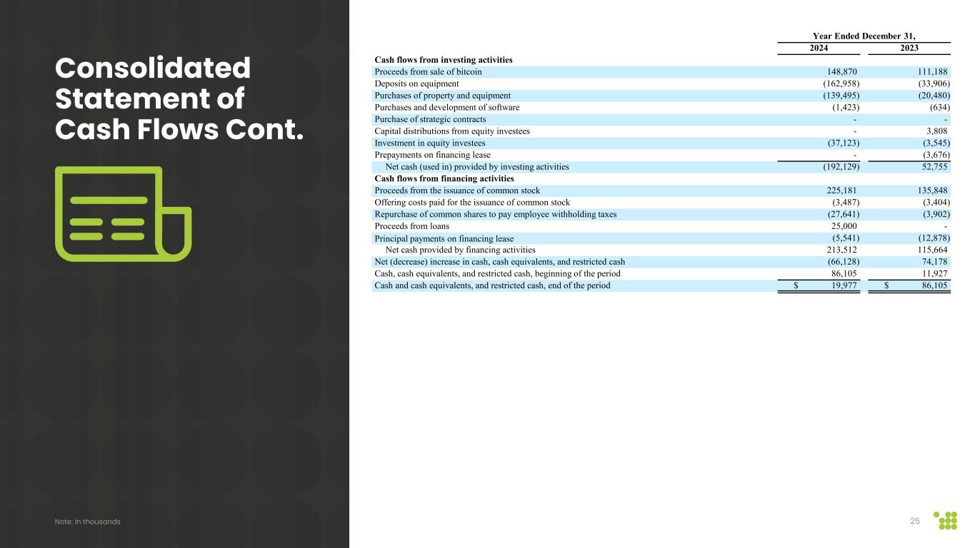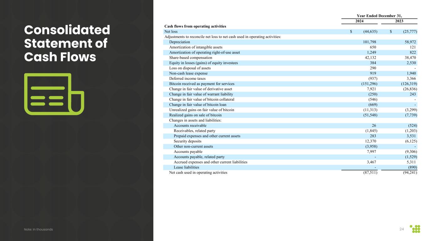 Year Ended December 31, 2024 2023 Cash flows from operating activities Net loss $ (44,635) $ (25,777) Adjustments to reconcile net loss to net cash used in operating activities: Depreciation 101,798 58,972 Amortization of intangible assets 650 121 Amortization of operating right-of-use asset 1,249 822 Share-based compensation 42,132 38,470 Equity in losses (gains) of equity investees 384 2,530 Loss on disposal of assets 290 - Non-cash lease expense 919 1,940 Deferred income taxes (937) 3,366 Bitcoin received as payment for services (151,296) (126,319) Change in fair value of derivative asset 7,921 (26,836) Change in fair value of warrant liability (250) 243 Change in fair value of bitcoin collateral (546) - Change in fair value of bitcoin loan (669) - Unrealized gains on fair value of bitcoin (11,313) (3,299) Realized gains on sale of bitcoin (51,548) (7,739) Changes in assets and liabilities: Accounts receivable 26 (524) Receivables, related party (1,845) (1,203) Prepaid expenses and other current assets 283 3,531 Security deposits 12,370 (6,125) Other non-current assets (3,958) - Accounts payable 7,997 (9,306) Accounts payable, related party - (1,529) Accrued expenses and other current liabilities 3,467 5,311 Lease liabilities - (890) Net cash used in operating activities (87,511) (94,241) Consolidated Statement of Cash Flows 24Note: In thousands