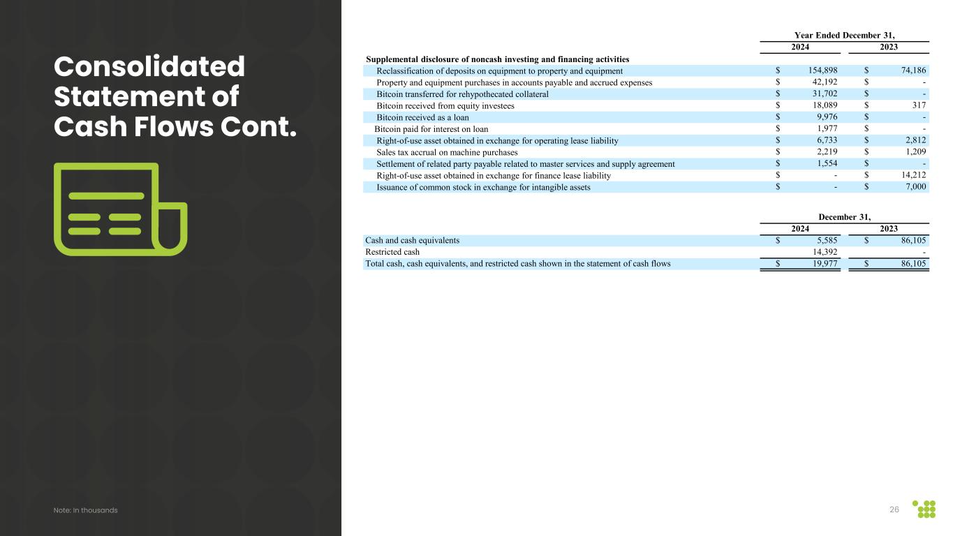 December 31, 2024 2023 Cash and cash equivalents $ 5,585 $ 86,105 Restricted cash 14,392 - Total cash, cash equivalents, and restricted cash shown in the statement of cash flows $ 19,977 $ 86,105 Year Ended December 31, 2024 2023 Supplemental disclosure of noncash investing and financing activities Reclassification of deposits on equipment to property and equipment $ 154,898 $ 74,186 Property and equipment purchases in accounts payable and accrued expenses $ 42,192 $ - Bitcoin transferred for rehypothecated collateral $ 31,702 $ - Bitcoin received from equity investees $ 18,089 $ 317 Bitcoin received as a loan $ 9,976 $ - Bitcoin paid for interest on loan $ 1,977 $ - Right-of-use asset obtained in exchange for operating lease liability $ 6,733 $ 2,812 Sales tax accrual on machine purchases $ 2,219 $ 1,209 Settlement of related party payable related to master services and supply agreement $ 1,554 $ - Right-of-use asset obtained in exchange for finance lease liability $ - $ 14,212 Issuance of common stock in exchange for intangible assets $ - $ 7,000 Consolidated Statement of Cash Flows Cont. 26Note: In thousands