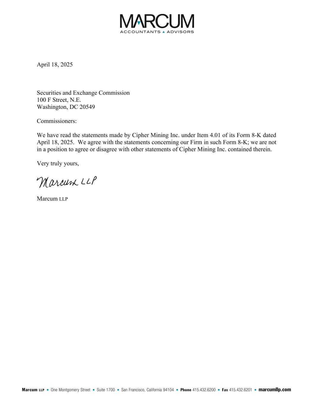 Marcum LLP n One Montgomery Street n Suite 1700 n San Francisco, California 94104 n Phone 415.432.6200 n Fax 415.432.6201 n marcumllp.com April 18, 2025 Securities and Exchange Commission 100 F Street, N.E. Washington, DC 20549 Commissioners: We have read the statements made by Cipher Mining Inc. under Item 4.01 of its Form 8-K dated April 18, 2025. We agree with the statements concerning our Firm in such Form 8-K; we are not in a position to agree or disagree with other statements of Cipher Mining Inc. contained therein. Very truly yours, Marcum LLP