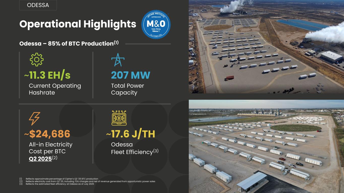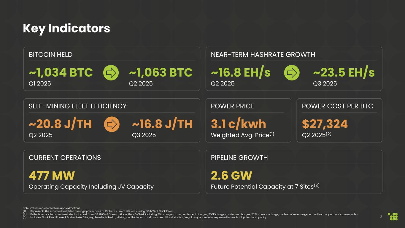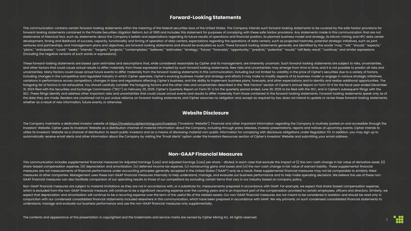 Forward-Looking Statements This communication contains certain forward-looking statements within the meaning of the federal securities laws of the United States. The Company intends such forward-looking statements to be covered by the safe harbor provisions for forward-looking statements contained in the Private Securities Litigation Reform Act of 1995 and includes this statement for purposes of complying with these safe harbor provisions. Any statements made in this communication that are not statements of historical fact, such as, statements about the Company’s beliefs and expectations regarding its future results of operations and financial position, its planned business model and strategy, its bitcoin mining and HPC data center development, timing and likelihood of success, capacity, functionality and timing of operation of data centers, expectations regarding the operations of data centers, such as projected hashrate, potential strategic initiatives, such as joint ventures and partnerships, and management plans and objectives, are forward-looking statements and should be evaluated as such. These forward-looking statements generally are identified by the words “may,” “will,” “should,” “expects,” “plans,” “anticipates,” “could,” “seeks,” “intends,” “targets,” “projects,” “contemplates,” “believes,” “estimates,” “strategy,” “future,” “forecasts,” “opportunity,” “predicts,” “potential,” “would,” “will likely result,” “continue,” and similar expressions (including the negative versions of such words or expressions). These forward-looking statements are based upon estimates and assumptions that, while considered reasonable by Cipher and its management, are inherently uncertain. Such forward-looking statements are subject to risks, uncertainties, and other factors that could cause actual results to differ materially from those expressed or implied by such forward looking statements. New risks and uncertainties may emerge from time to time, and it is not possible to predict all risks and uncertainties. Many factors could cause actual future events to differ materially from the forward-looking statements in this communication, including but not limited to: volatility in the price of Cipher’s securities due to a variety of factors, including changes in the competitive and regulated industry in which Cipher operates, Cipher’s evolving business model and strategy and efforts it may make to modify aspects of its business model or engage in various strategic initiatives, variations in performance across competitors, changes in laws and regulations affecting Cipher’s business, and the ability to implement business plans, forecasts, and other expectations and to identify and realize additional opportunities. The foregoing list of factors is not exhaustive. You should carefully consider the foregoing factors and the other risks and uncertainties described in the “Risk Factors” section of Cipher’s Annual Report on Form 10-K for the fiscal year ended December 31, 2024 filed with the Securities and Exchange Commission (“SEC”) on February 25, 2025, Cipher’s Quarterly Report on Form 10-Q for the quarterly period ended June 30, 2025 to be filed with the SEC, and in Cipher’s subsequent filings with the SEC. These filings identify and address other important risks and uncertainties that could cause actual events and results to differ materially from those contained in the forward-looking statements. Forward-looking statements speak only as of the date they are made. Readers are cautioned not to put undue reliance on forward-looking statements, and Cipher assumes no obligation and, except as required by law, does not intend to update or revise these forward-looking statements, whether as a result of new information, future events, or otherwise. Website Disclosure The Company maintains a dedicated investor website at https://investors.ciphermining.com/investors (“Investors’ Website”). Financial and other important information regarding the Company is routinely posted on and accessible through the Investors’ Website. Cipher uses its Investors’ Website as a distribution channel of material information about the Company, including through press releases, investor presentations, reports and notices of upcoming events. Cipher intends to utilize its Investors’ Website as a channel of distribution to reach public investors and as a means of disclosing material non-public information for complying with disclosure obligations under Regulation FD. In addition, you may sign up to automatically receive email alerts and other information about the Company by visiting the “Email Alerts” option under the Investors Resources section of Cipher’s Investors’ Website and submitting your email address. Non-GAAP Financial Measures This communication includes supplemental financial measures for Adjusted Earnings (Loss) and Adjusted Earnings (Loss) per share - diluted, in each case that exclude the impact of (i) the non-cash change in fair value of derivative asset, (ii) share-based compensation expense, (iii) depreciation and amortization, (iv) deferred income tax expense, (v) nonrecurring gains and losses and (vi) the non-cash change in fair value of warrant liability. These supplemental financial measures are not measurements of financial performance under accounting principles generally accepted in the United States (“GAAP”) and, as a result, these supplemental financial measures may not be comparable to similarly titled measures of other companies. Management uses these non-GAAP financial measures internally to help understand, manage, and evaluate our business performance and to help make operating decisions. We believe the use of these non- GAAP financial measures can also facilitate comparison of our operating results to those of our competitors by excluding certain items that vary in our 