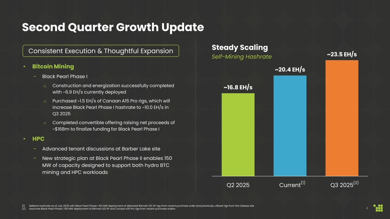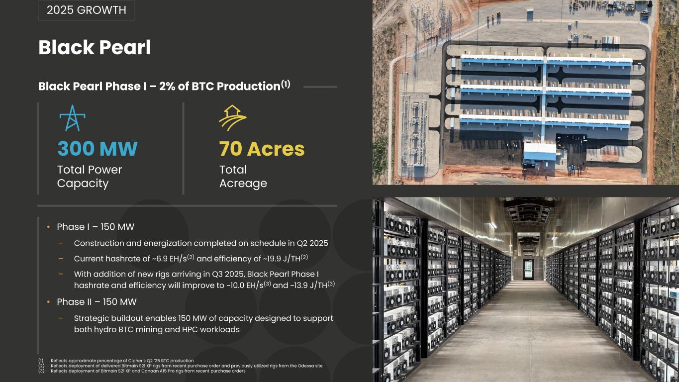 Black Pearl Phase I – 2% of BTC Production(1) Black Pearl 2025 GROWTH • Phase I – 150 MW – Construction and energization completed on schedule in Q2 2025 – Current hashrate of ~6.9 EH/s(2) and efficiency of ~19.9 J/TH(2) – With addition of new rigs arriving in Q3 2025, Black Pearl Phase I hashrate and efficiency will improve to ~10.0 EH/s(3) and ~13.9 J/TH(3) • Phase II – 150 MW – Strategic buildout enables 150 MW of capacity designed to support both hydro BTC mining and HPC workloads (1) Reflects approximate percentage of Cipher’s Q2 ‘25 BTC production (2) Reflects deployment of delivered Bitmain S21 XP rigs from recent purchase order and previously utilized rigs from the Odessa site (3) Reflects deployment of Bitmain S21 XP and Canaan A15 Pro rigs from recent purchase orders 300 MW Total Power Capacity 70 Acres Total Acreage
