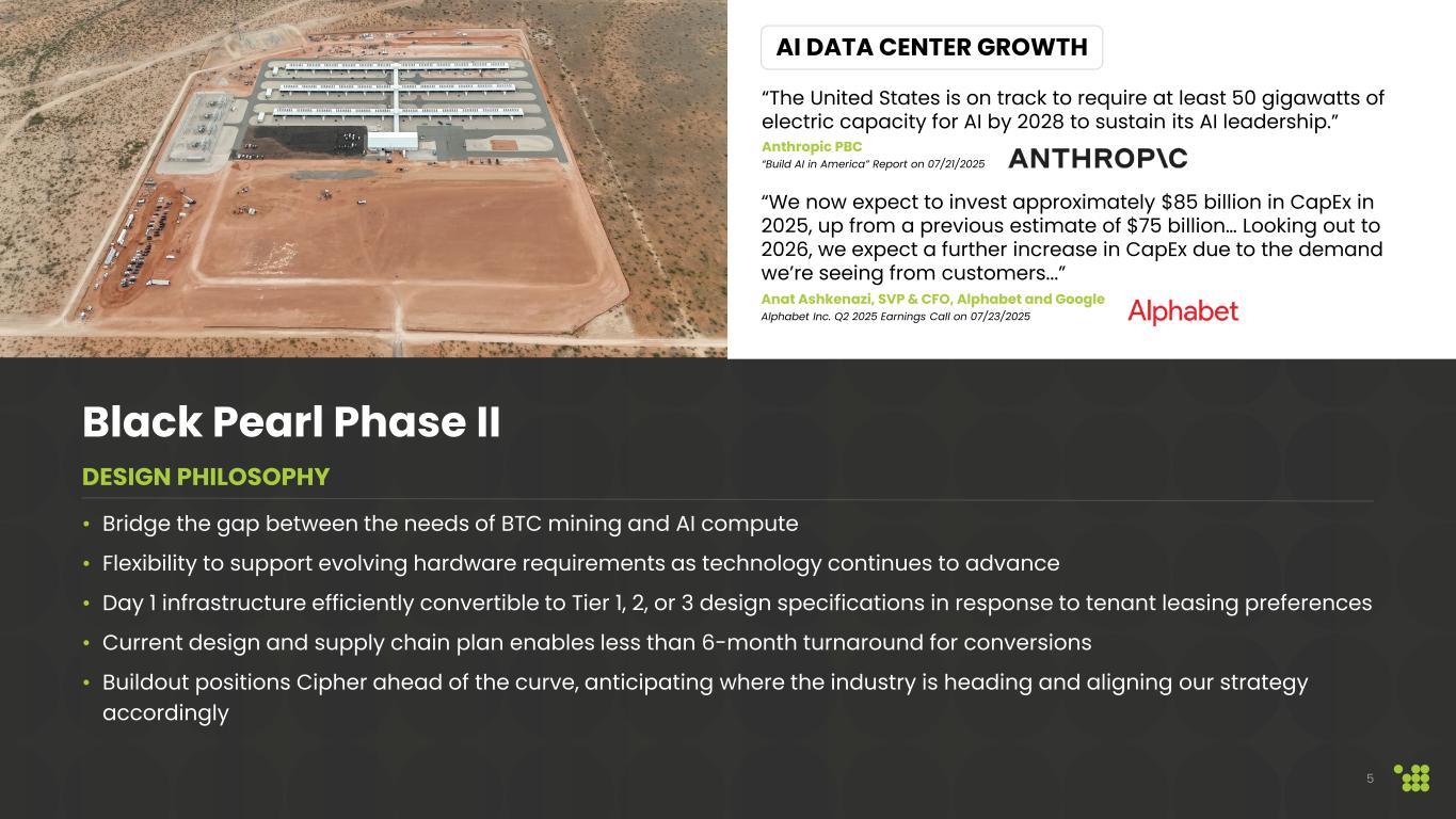 Black Pearl Phase II 5 DESIGN PHILOSOPHY • Bridge the gap between the needs of BTC mining and AI compute • Flexibility to support evolving hardware requirements as technology continues to advance • Day 1 infrastructure efficiently convertible to Tier 1, 2, or 3 design specifications in response to tenant leasing preferences • Current design and supply chain plan enables less than 6-month turnaround for conversions • Buildout positions Cipher ahead of the curve, anticipating where the industry is heading and aligning our strategy accordingly “The United States is on track to require at least 50 gigawatts of electric capacity for AI by 2028 to sustain its AI leadership.” Anthropic PBC “Build AI in America” Report on 07/21/2025 AI DATA CENTER GROWTH “We now expect to invest approximately $85 billion in CapEx in 2025, up from a previous estimate of $75 billion… Looking out to 2026, we expect a further increase in CapEx due to the demand we’re seeing from customers...” Anat Ashkenazi, SVP & CFO, Alphabet and Google Alphabet Inc. Q2 2025 Earnings Call on 07/23/2025