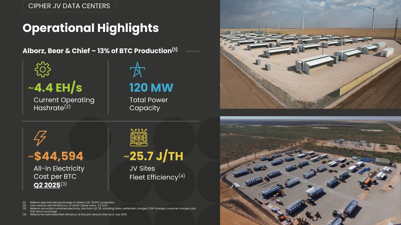 Operational Highlights CIPHER JV DATA CENTERS (1) Reflects approximate percentage of Cipher’s Q2 ‘25 BTC production (2) Joint venture with WindHQ LLC, of which Cipher owns ~2.2 EH/s (3) Reflects reconciled combined electricity cost from Q2 ‘25, including taxes, settlement charges, TDSP charges, customer charges, and 2021 storm surcharge (4) Reflects the estimated fleet efficiency at the joint venture sites as of July 2025 Alborz, Bear & Chief – 13% of BTC Production(1) ~$44,594 All-in Electricity Cost per BTC Q2 2025(3) ~4.4 EH/s Current Operating Hashrate(2) Total Power Capacity JV Sites Fleet Efficiency(4) ~25.7 J/TH 120 MW