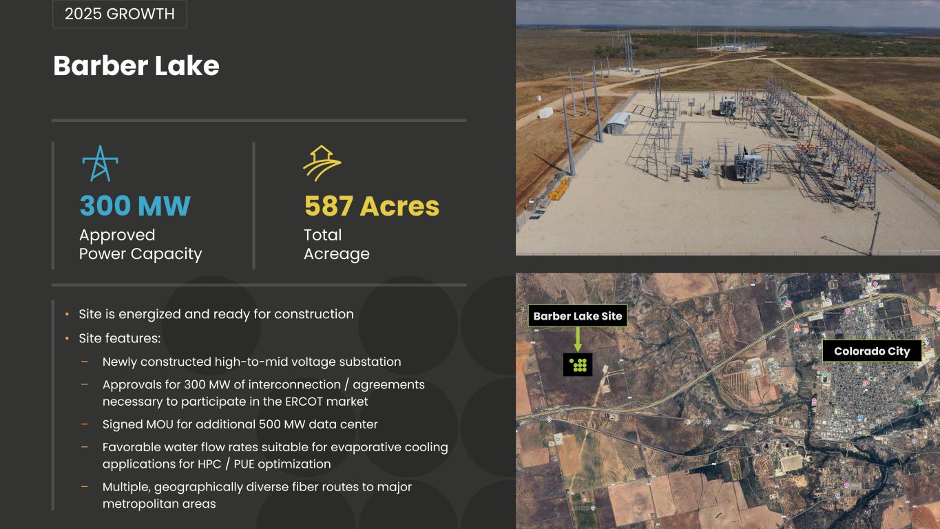 11 Barber Lake 2025 GROWTH 300 MW Approved Power Capacity 587 Acres Total Acreage • Site is energized and ready for construction • Site features: – Newly constructed high-to-mid voltage substation – Approvals for 300 MW of interconnection / agreements necessary to participate in the ERCOT market – Signed MOU for additional 500 MW data center – Favorable water flow rates suitable for evaporative cooling applications for HPC / PUE optimization – Multiple, geographically diverse fiber routes to major metropolitan areas Barber Lake Site Colorado City