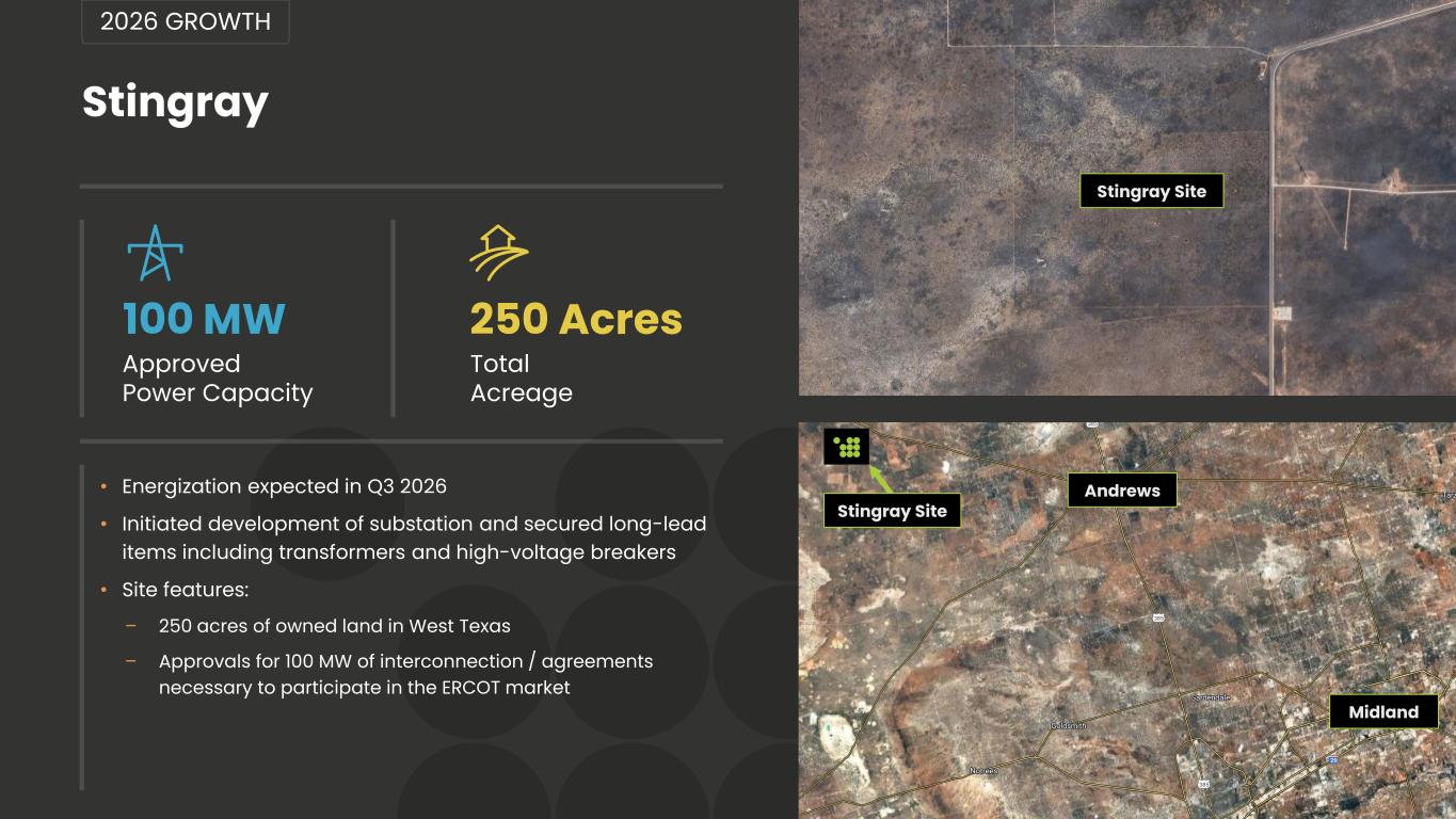 Stingray 2026 GROWTH 100 MW Approved Power Capacity 250 Acres Total Acreage • Energization expected in Q3 2026 • Initiated development of substation and secured long-lead items including transformers and high-voltage breakers • Site features: – 250 acres of owned land in West Texas – Approvals for 100 MW of interconnection / agreements necessary to participate in the ERCOT market 12 Stingray Site Andrews Stingray Site Midland