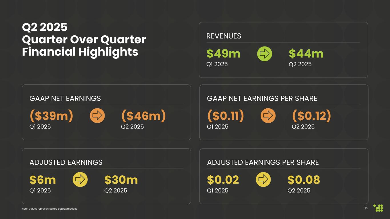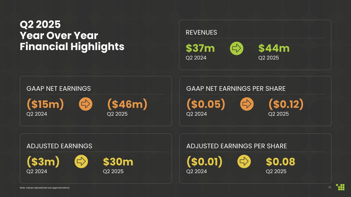 ($39m) Q1 2025 ($46m) Q2 2025 GAAP NET EARNINGS ($0.11) Q1 2025 ($0.12) Q2 2025 GAAP NET EARNINGS PER SHARE $49m Q1 2025 $44m Q2 2025 REVENUES Q2 2025 Quarter Over Quarter Financial Highlights 15Note: Values represented are approximations $6m Q1 2025 $30m Q2 2025 ADJUSTED EARNINGS $0.02 Q1 2025 $0.08 Q2 2025 ADJUSTED EARNINGS PER SHARE