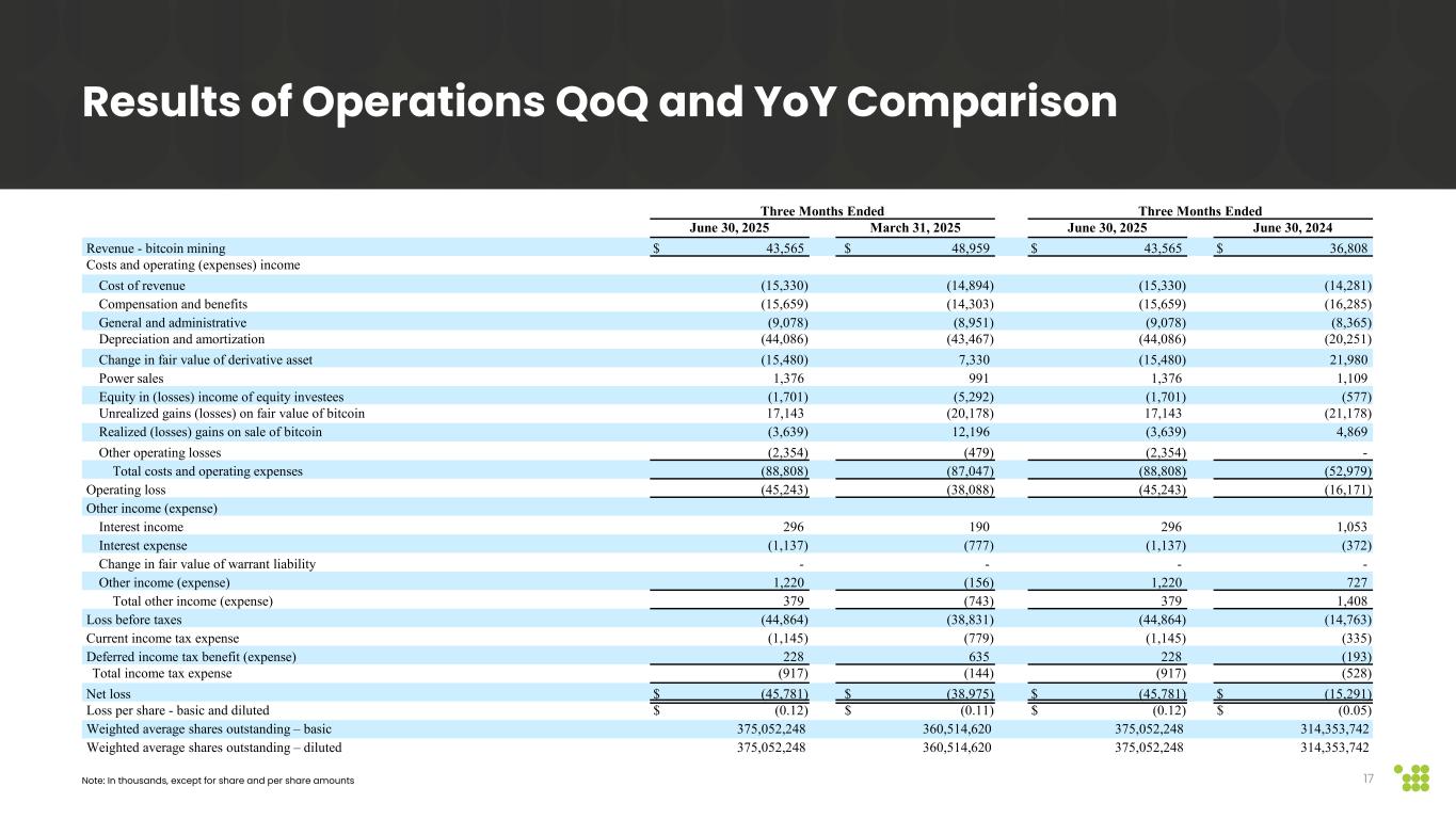 Three Months Ended Three Months Ended June 30, 2025 March 31, 2025 June 30, 2025 June 30, 2024 Revenue - bitcoin mining $ 43,565 $ 48,959 $ 43,565 $ 36,808 Costs and operating (expenses) income Cost of revenue (15,330) (14,894) (15,330) (14,281) Compensation and benefits (15,659) (14,303) (15,659) (16,285) General and administrative (9,078) (8,951) (9,078) (8,365) Depreciation and amortization (44,086) (43,467) (44,086) (20,251) Change in fair value of derivative asset (15,480) 7,330 (15,480) 21,980 Power sales 1,376 991 1,376 1,109 Equity in (losses) income of equity investees (1,701) (5,292) (1,701) (577) Unrealized gains (losses) on fair value of bitcoin 17,143 (20,178) 17,143 (21,178) Realized (losses) gains on sale of bitcoin (3,639) 12,196 (3,639) 4,869 Other operating losses (2,354) (479) (2,354) - Total costs and operating expenses (88,808) (87,047) (88,808) (52,979) Operating loss (45,243) (38,088) (45,243) (16,171) Other income (expense) Interest income 296 190 296 1,053 Interest expense (1,137) (777) (1,137) (372) Change in fair value of warrant liability - - - - Other income (expense) 1,220 (156) 1,220 727 Total other income (expense) 379 (743) 379 1,408 Loss before taxes (44,864) (38,831) (44,864) (14,763) Current income tax expense (1,145) (779) (1,145) (335) Deferred income tax benefit (expense) 228 635 228 (193) Total income tax expense (917) (144) (917) (528) Net loss $ (45,781) $ (38,975) $ (45,781) $ (15,291) Loss per share - basic and diluted $ (0.12) $ (0.11) $ (0.12) $ (0.05) Weighted average shares outstanding – basic 375,052,248 360,514,620 375,052,248 314,353,742 Weighted average shares outstanding – diluted 375,052,248 360,514,620 375,052,248 314,353,742 Results of Operations QoQ and YoY Comparison 17Note: In thousands, except for share and per share amounts