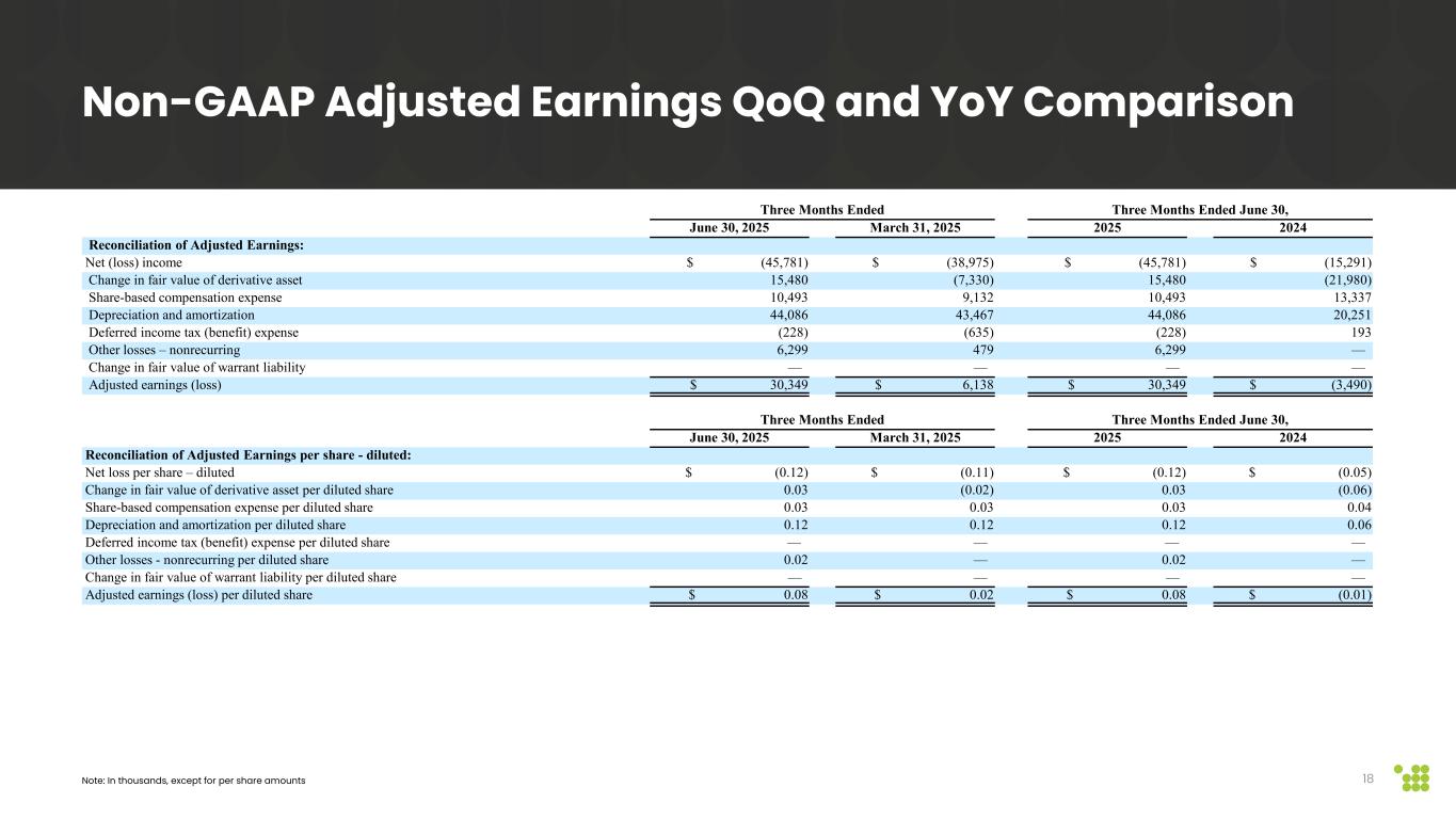 Three Months Ended Three Months Ended June 30, June 30, 2025 March 31, 2025 2025 2024 Reconciliation of Adjusted Earnings: Net (loss) income $ (45,781) $ (38,975) $ (45,781) $ (15,291) Change in fair value of derivative asset 15,480 (7,330) 15,480 (21,980) Share-based compensation expense 10,493 9,132 10,493 13,337 Depreciation and amortization 44,086 43,467 44,086 20,251 Deferred income tax (benefit) expense (228) (635) (228) 193 Other losses – nonrecurring 6,299 479 6,299 — Change in fair value of warrant liability — — — — Adjusted earnings (loss) $ 30,349 $ 6,138 $ 30,349 $ (3,490) Three Months Ended Three Months Ended June 30, June 30, 2025 March 31, 2025 2025 2024 Reconciliation of Adjusted Earnings per share - diluted: Net loss per share – diluted $ (0.12) $ (0.11) $ (0.12) $ (0.05) Change in fair value of derivative asset per diluted share 0.03 (0.02) 0.03 (0.06) Share-based compensation expense per diluted share 0.03 0.03 0.03 0.04 Depreciation and amortization per diluted share 0.12 0.12 0.12 0.06 Deferred income tax (benefit) expense per diluted share — — — — Other losses - nonrecurring per diluted share 0.02 — 0.02 — Change in fair value of warrant liability per diluted share — — — — Adjusted earnings (loss) per diluted share $ 0.08 $ 0.02 $ 0.08 $ (0.01) Non-GAAP Adjusted Earnings QoQ and YoY Comparison 18Note: In thousands, except for per share amounts
