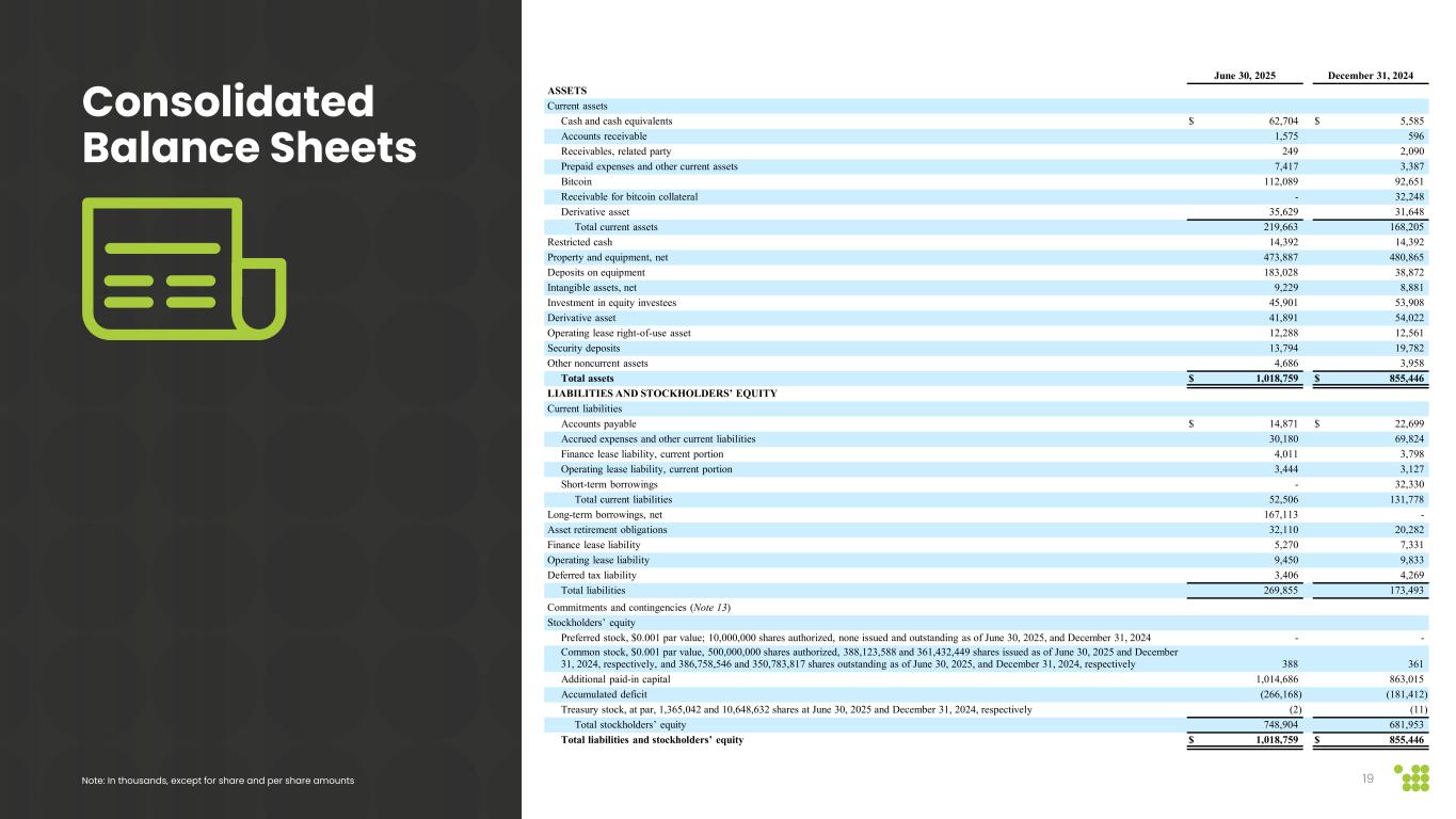 June 30, 2025 December 31, 2024 ASSETS Current assets Cash and cash equivalents $ 62,704 $ 5,585 Accounts receivable 1,575 596 Receivables, related party 249 2,090 Prepaid expenses and other current assets 7,417 3,387 Bitcoin 112,089 92,651 Receivable for bitcoin collateral - 32,248 Derivative asset 35,629 31,648 Total current assets 219,663 168,205 Restricted cash 14,392 14,392 Property and equipment, net 473,887 480,865 Deposits on equipment 183,028 38,872 Intangible assets, net 9,229 8,881 Investment in equity investees 45,901 53,908 Derivative asset 41,891 54,022 Operating lease right-of-use asset 12,288 12,561 Security deposits 13,794 19,782 Other noncurrent assets 4,686 3,958 Total assets $ 1,018,759 $ 855,446 LIABILITIES AND STOCKHOLDERS’ EQUITY Current liabilities Accounts payable $ 14,871 $ 22,699 Accrued expenses and other current liabilities 30,180 69,824 Finance lease liability, current portion 4,011 3,798 Operating lease liability, current portion 3,444 3,127 Short-term borrowings - 32,330 Total current liabilities 52,506 131,778 Long-term borrowings, net 167,113 - Asset retirement obligations 32,110 20,282 Finance lease liability 5,270 7,331 Operating lease liability 9,450 9,833 Deferred tax liability 3,406 4,269 Total liabilities 269,855 173,493 Commitments and contingencies (Note 13) Stockholders’ equity Preferred stock, $0.001 par value; 10,000,000 shares authorized, none issued and outstanding as of June 30, 2025, and December 31, 2024 - - Common stock, $0.001 par value, 500,000,000 shares authorized, 388,123,588 and 361,432,449 shares issued as of June 30, 2025 and December 31, 2024, respectively, and 386,758,546 and 350,783,817 shares outstanding as of June 30, 2025, and December 31, 2024, respectively 388 361 Additional paid-in capital 1,014,686 863,015 Accumulated deficit (266,168) (181,412) Treasury stock, at par, 1,365,042 and 10,648,632 shares at June 30, 2025 and December 31, 2024, respectively (2) (11) Total stockholders’ equity 748,904 681,953 Total liabilities and stockholders’ equity $ 1,018,759 $ 855,446 Consolidated Balance Sheets 19Note: In thousands, except for share and per share amounts