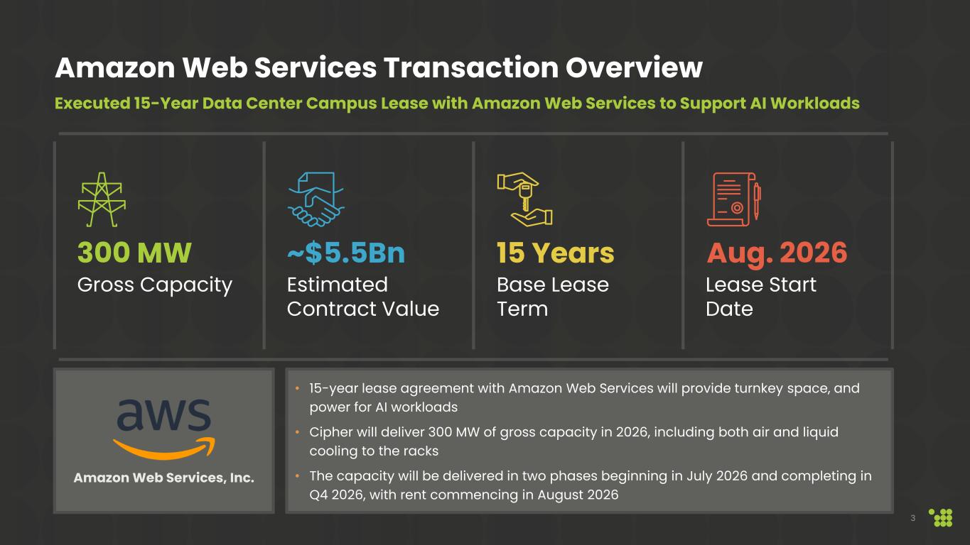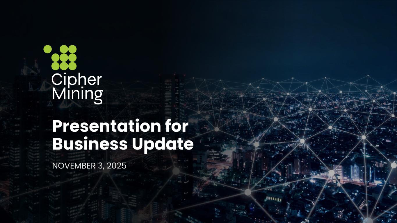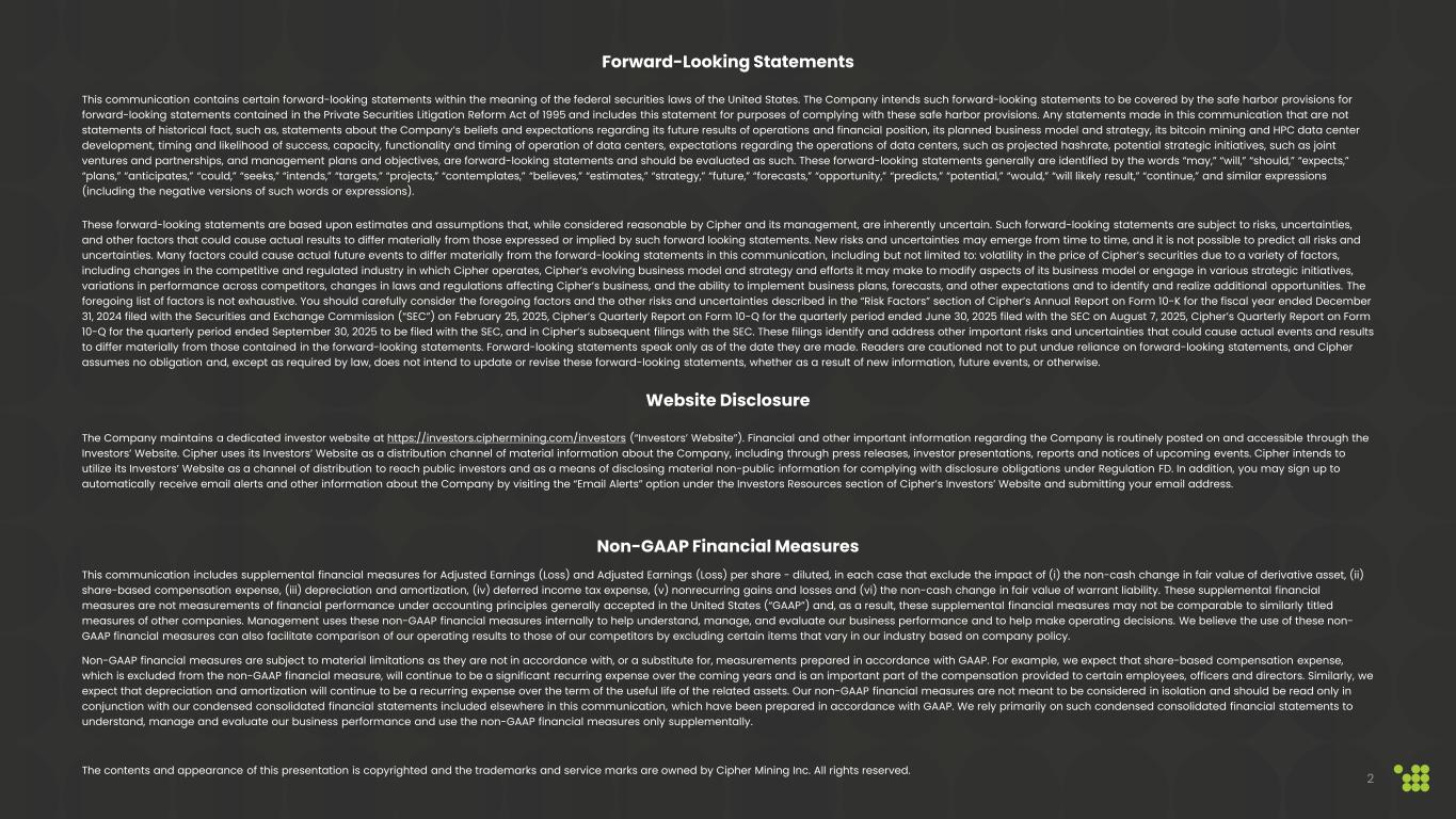 Forward-Looking Statements This communication contains certain forward-looking statements within the meaning of the federal securities laws of the United States. The Company intends such forward-looking statements to be covered by the safe harbor provisions for forward-looking statements contained in the Private Securities Litigation Reform Act of 1995 and includes this statement for purposes of complying with these safe harbor provisions. Any statements made in this communication that are not statements of historical fact, such as, statements about the Company’s beliefs and expectations regarding its future results of operations and financial position, its planned business model and strategy, its bitcoin mining and HPC data center development, timing and likelihood of success, capacity, functionality and timing of operation of data centers, expectations regarding the operations of data centers, such as projected hashrate, potential strategic initiatives, such as joint ventures and partnerships, and management plans and objectives, are forward-looking statements and should be evaluated as such. These forward-looking statements generally are identified by the words “may,” “will,” “should,” “expects,” “plans,” “anticipates,” “could,” “seeks,” “intends,” “targets,” “projects,” “contemplates,” “believes,” “estimates,” “strategy,” “future,” “forecasts,” “opportunity,” “predicts,” “potential,” “would,” “will likely result,” “continue,” and similar expressions (including the negative versions of such words or expressions). These forward-looking statements are based upon estimates and assumptions that, while considered reasonable by Cipher and its management, are inherently uncertain. Such forward-looking statements are subject to risks, uncertainties, and other factors that could cause actual results to differ materially from those expressed or implied by such forward looking statements. New risks and uncertainties may emerge from time to time, and it is not possible to predict all risks and uncertainties. Many factors could cause actual future events to differ materially from the forward-looking statements in this communication, including but not limited to: volatility in the price of Cipher’s securities due to a variety of factors, including changes in the competitive and regulated industry in which Cipher operates, Cipher’s evolving business model and strategy and efforts it may make to modify aspects of its business model or engage in various strategic initiatives, variations in performance across competitors, changes in laws and regulations affecting Cipher’s business, and the ability to implement business plans, forecasts, and other expectations and to identify and realize additional opportunities. The foregoing list of factors is not exhaustive. You should carefully consider the foregoing factors and the other risks and uncertainties described in the “Risk Factors” section of Cipher’s Annual Report on Form 10-K for the fiscal year ended December 31, 2024 filed with the Securities and Exchange Commission (“SEC”) on February 25, 2025, Cipher’s Quarterly Report on Form 10-Q for the quarterly period ended June 30, 2025 filed with the SEC on August 7, 2025, Cipher’s Quarterly Report on Form 10-Q for the quarterly period ended September 30, 2025 to be filed with the SEC, and in Cipher’s subsequent filings with the SEC. These filings identify and address other important risks and uncertainties that could cause actual events and results to differ materially from those contained in the forward-looking statements. Forward-looking statements speak only as of the date they are made. Readers are cautioned not to put undue reliance on forward-looking statements, and Cipher assumes no obligation and, except as required by law, does not intend to update or revise these forward-looking statements, whether as a result of new information, future events, or otherwise. Website Disclosure The Company maintains a dedicated investor website at https://investors.ciphermining.com/investors (“Investors’ Website”). Financial and other important information regarding the Company is routinely posted on and accessible through the Investors’ Website. Cipher uses its Investors’ Website as a distribution channel of material information about the Company, including through press releases, investor presentations, reports and notices of upcoming events. Cipher intends to utilize its Investors’ Website as a channel of distribution to reach public investors and as a means of disclosing material non-public information for complying with disclosure obligations under Regulation FD. In addition, you may sign up to automatically receive email alerts and other information about the Company by visiting the “Email Alerts” option under the Investors Resources section of Cipher’s Investors’ Website and submitting your email address. Non-GAAP Financial Measures This communication includes supplemental financial measures for Adjusted Earnings (Loss) and Adjusted Earnings (Loss) per share - diluted, in each case that exclude the impact of (i) the non-cash change in fair value of derivative asset, (ii) share-based compensation expense, (iii) depreciation and amortization, (iv) deferred income tax expense, (v) nonrecurring gains and losses and (vi) the non-cash change in fair value of warrant liability. These supplemental financial measures are not measurements of financial performance under accounting principles generally accepted in the United States (“GAAP”) and, as a result, these supplemental financial measures may not be comparable to similarly titled measures of other companies. Management uses these non-GAAP financial measures internally to help understand, manage, and evaluate our business performance and to help make operating decisions. We believe the use of these non- GAAP financial measures