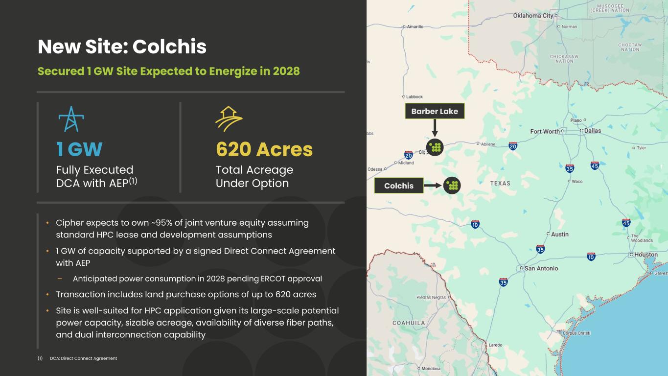 Secured 1 GW Site Expected to Energize in 2028 • Cipher expects to own ~95% of joint venture equity assuming standard HPC lease and development assumptions • 1 GW of capacity supported by a signed Direct Connect Agreement with AEP – Anticipated power consumption in 2028 pending ERCOT approval • Transaction includes land purchase options of up to 620 acres • Site is well-suited for HPC application given its large-scale potential power capacity, sizable acreage, availability of diverse fiber paths, and dual interconnection capability 1 GW Fully Executed DCA with AEP(1) 620 Acres Total Acreage Under Option New Site: Colchis 4 Colchis Barber Lake (1) DCA: Direct Connect Agreement