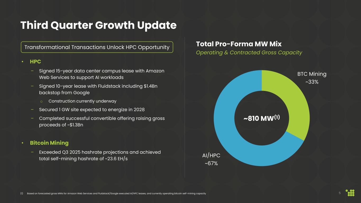 BTC Mining ~33% AI/HPC ~67% Total Pro-Forma MW Mix Operating & Contracted Gross Capacity Third Quarter Growth Update 5 Transformational Transactions Unlock HPC Opportunity • HPC – Signed 15-year data center campus lease with Amazon Web Services to support AI workloads – Signed 10-year lease with Fluidstack including $1.4Bn backstop from Google o Construction currently underway – Secured 1 GW site expected to energize in 2028 – Completed successful convertible offering raising gross proceeds of ~$1.3Bn • Bitcoin Mining – Exceeded Q3 2025 hashrate projections and achieved total self-mining hashrate of ~23.6 EH/s (1) Based on forecasted gross MWs for Amazon Web Services and Fluidstack/Google executed AI/HPC leases, and currently operating bitcoin self-mining capacity ~810 MW(1)