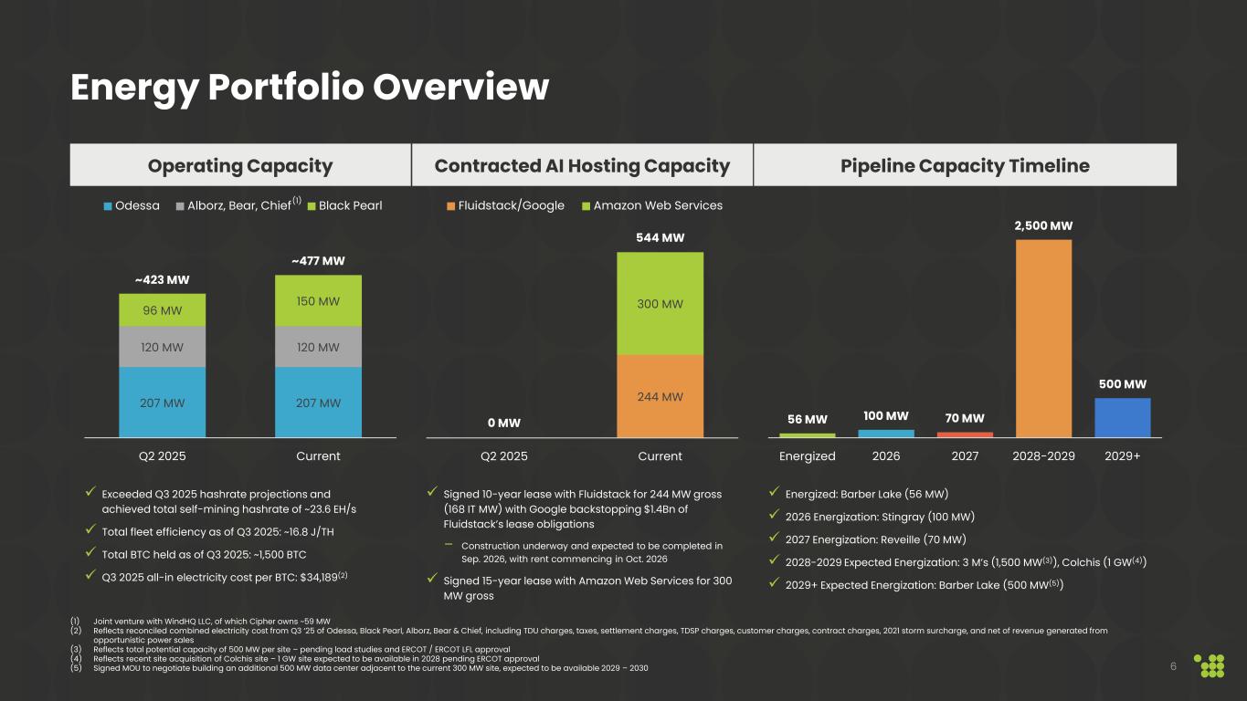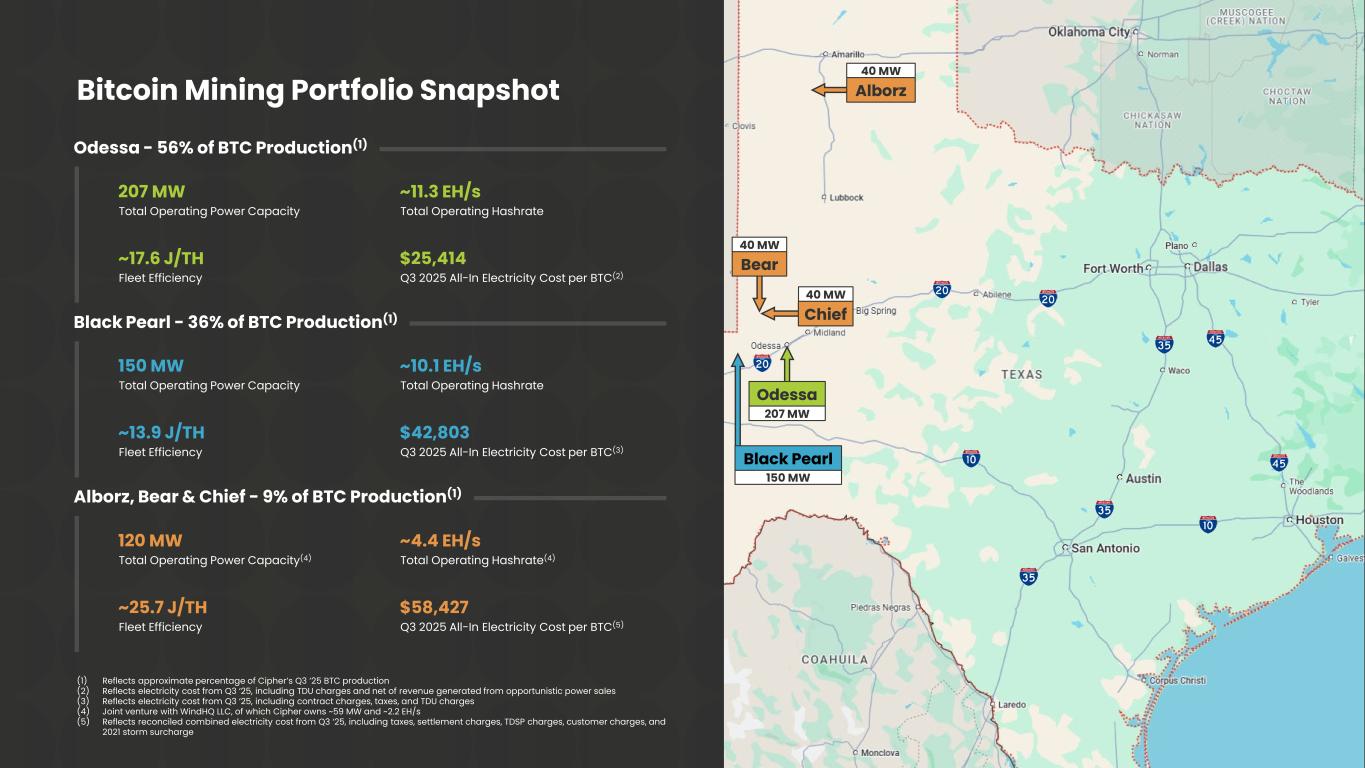 Bitcoin Mining Portfolio Snapshot Alborz 207 MW Total Operating Power Capacity Odessa - 56% of BTC Production(1) Black Pearl - 36% of BTC Production(1) Alborz, Bear & Chief - 9% of BTC Production(1) Odessa Bear Chief 40 MW 40 MW 207 MW 150 MW Black Pearl 40 MW ~17.6 J/TH Fleet Efficiency ~11.3 EH/s Total Operating Hashrate $25,414 Q3 2025 All-In Electricity Cost per BTC(2) 150 MW Total Operating Power Capacity ~13.9 J/TH Fleet Efficiency ~10.1 EH/s Total Operating Hashrate $42,803 Q3 2025 All-In Electricity Cost per BTC(3) 120 MW Total Operating Power Capacity(4) ~25.7 J/TH Fleet Efficiency ~4.4 EH/s Total Operating Hashrate(4) $58,427 Q3 2025 All-In Electricity Cost per BTC(5) (1) Reflects approximate percentage of Cipher’s Q3 ’25 BTC production (2) Reflects electricity cost from Q3 ‘25, including TDU charges and net of revenue generated from opportunistic power sales (3) Reflects electricity cost from Q3 ‘25, including contract charges, taxes, and TDU charges (4) Joint venture with WindHQ LLC, of which Cipher owns ~59 MW and ~2.2 EH/s (5) Reflects reconciled combined electricity cost from Q3 ‘25, including taxes, settlement charges, TDSP charges, customer charges, and 2021 storm surcharge