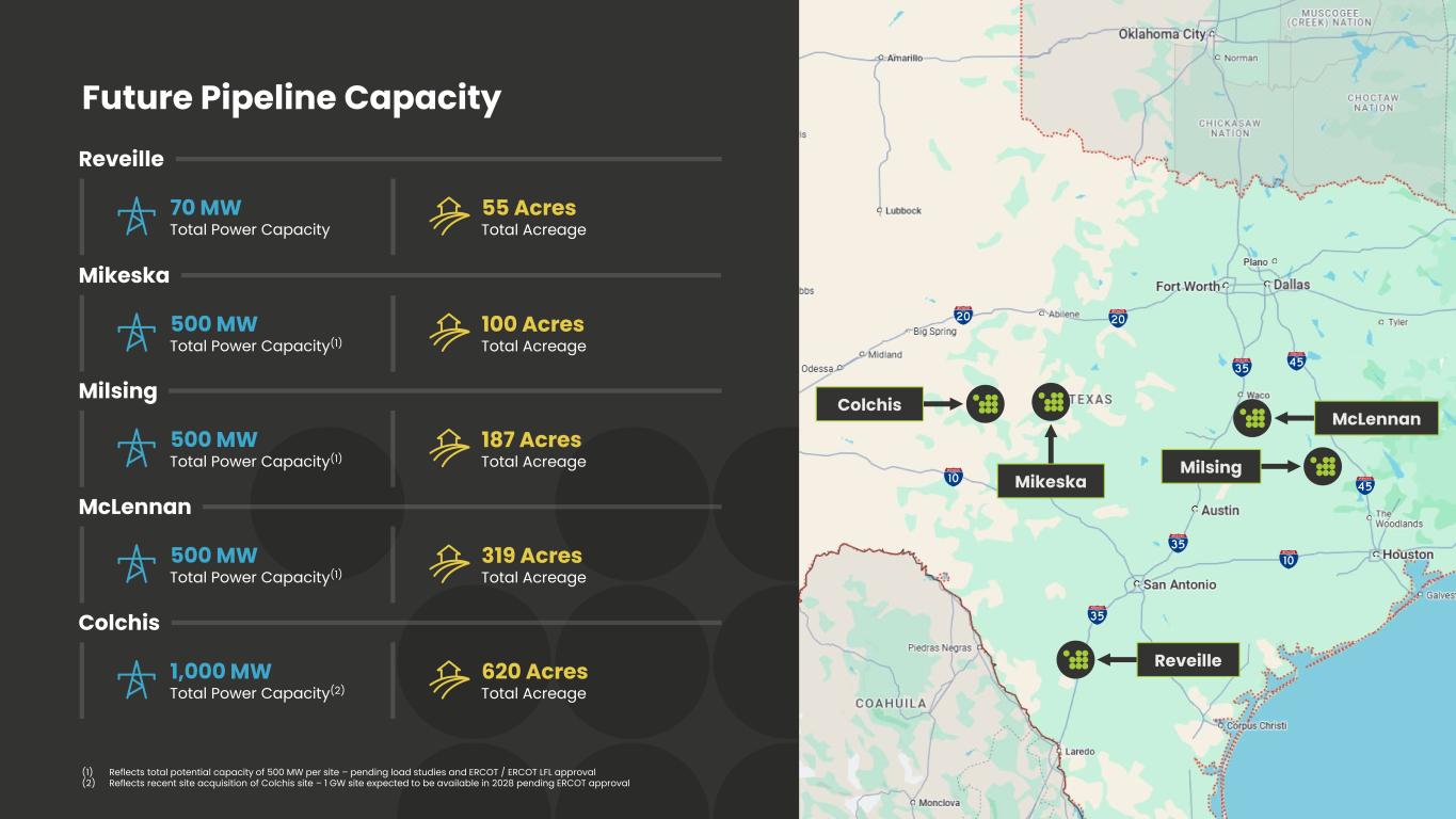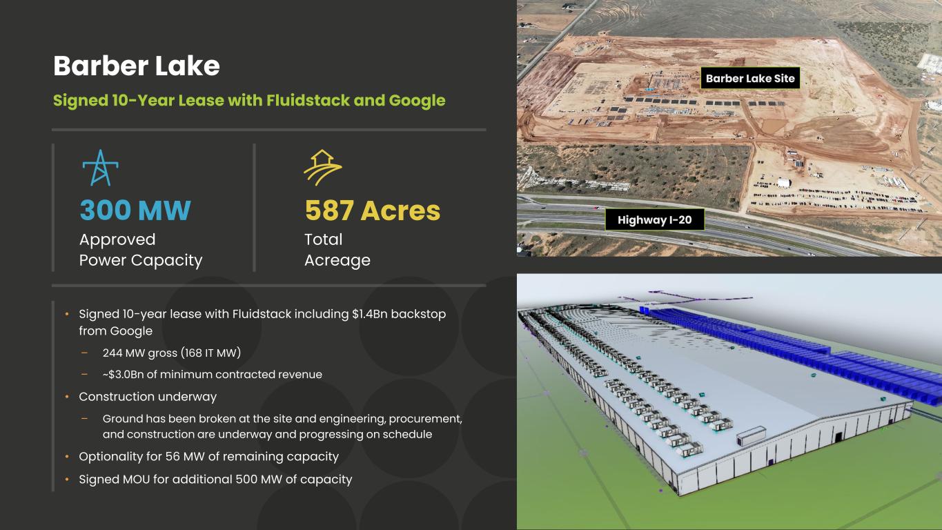 Signed 10-Year Lease with Fluidstack and Google • Signed 10-year lease with Fluidstack including $1.4Bn backstop from Google – 244 MW gross (168 IT MW) – ~$3.0Bn of minimum contracted revenue • Construction underway – Ground has been broken at the site and engineering, procurement, and construction are underway and progressing on schedule • Optionality for 56 MW of remaining capacity • Signed MOU for additional 500 MW of capacity 300 MW Approved Power Capacity 587 Acres Total Acreage Barber Lake Barber Lake Site Highway I-20