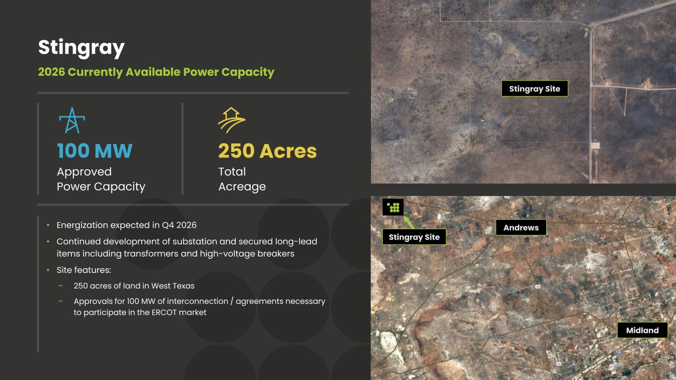 2026 Currently Available Power Capacity • Energization expected in Q4 2026 • Continued development of substation and secured long-lead items including transformers and high-voltage breakers • Site features: – 250 acres of land in West Texas – Approvals for 100 MW of interconnection / agreements necessary to participate in the ERCOT market 100 MW Approved Power Capacity 250 Acres Total Acreage Stingray 11 Stingray Site Andrews Stingray Site Midland