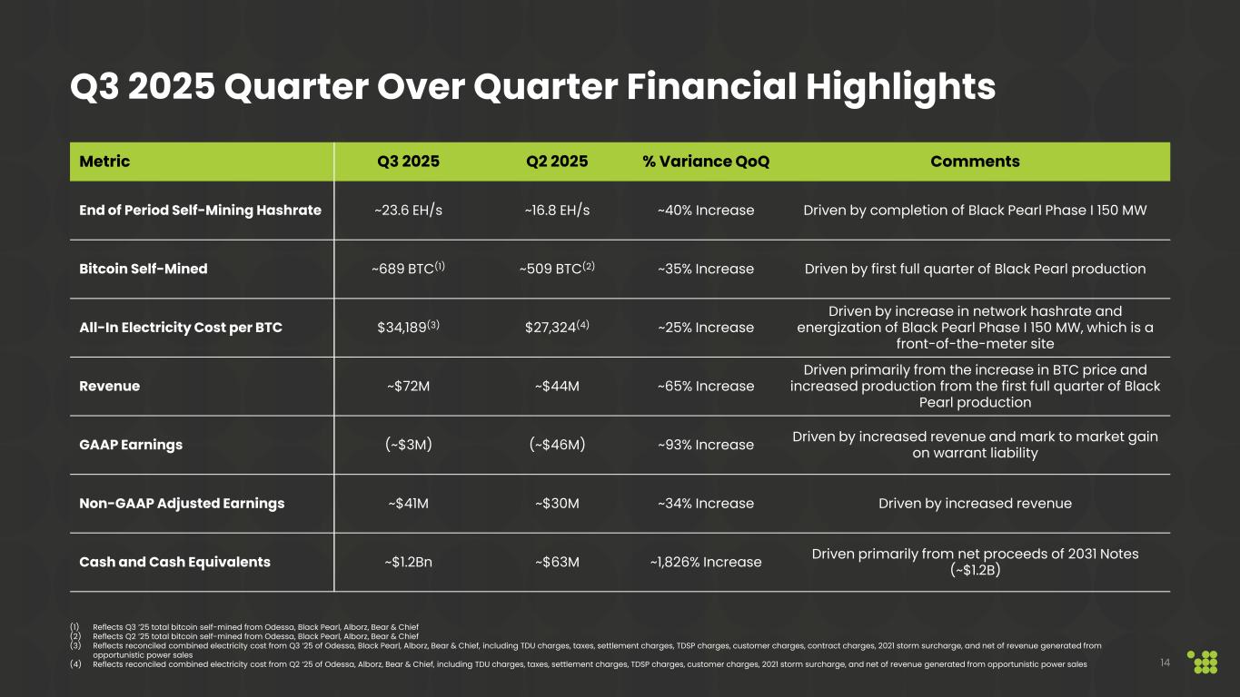 14 Metric Q3 2025 Q2 2025 % Variance QoQ Comments End of Period Self-Mining Hashrate ~23.6 EH/s ~16.8 EH/s ~40% Increase Driven by completion of Black Pearl Phase I 150 MW Bitcoin Self-Mined ~689 BTC(1) ~509 BTC(2) ~35% Increase Driven by first full quarter of Black Pearl production All-In Electricity Cost per BTC $34,189(3) $27,324(4) ~25% Increase Driven by increase in network hashrate and energization of Black Pearl Phase I 150 MW, which is a front-of-the-meter site Revenue ~$72M ~$44M ~65% Increase Driven primarily from the increase in BTC price and increased production from the first full quarter of Black Pearl production GAAP Earnings (~$3M) (~$46M) ~93% Increase Driven by increased revenue and mark to market gain on warrant liability Non-GAAP Adjusted Earnings ~$41M ~$30M ~34% Increase Driven by increased revenue Cash and Cash Equivalents ~$1.2Bn ~$63M ~1,826% Increase Driven primarily from net proceeds of 2031 Notes (~$1.2B) Q3 2025 Quarter Over Quarter Financial Highlights (1) Reflects Q3 ’25 total bitcoin self-mined from Odessa, Black Pearl, Alborz, Bear & Chief (2) Reflects Q2 ’25 total bitcoin self-mined from Odessa, Black Pearl, Alborz, Bear & Chief (3) Reflects reconciled combined electricity cost from Q3 ‘25 of Odessa, Black Pearl, Alborz, Bear & Chief, including TDU charges, taxes, settlement charges, TDSP charges, customer charges, contract charges, 2021 storm surcharge, and net of revenue generated from opportunistic power sales (4) Reflects reconciled combined electricity cost from Q2 ‘25 of Odessa, Alborz, Bear & Chief, including TDU charges, taxes, settlement charges, TDSP charges, customer charges, 2021 storm surcharge, and net of revenue generated from opportunistic power sales