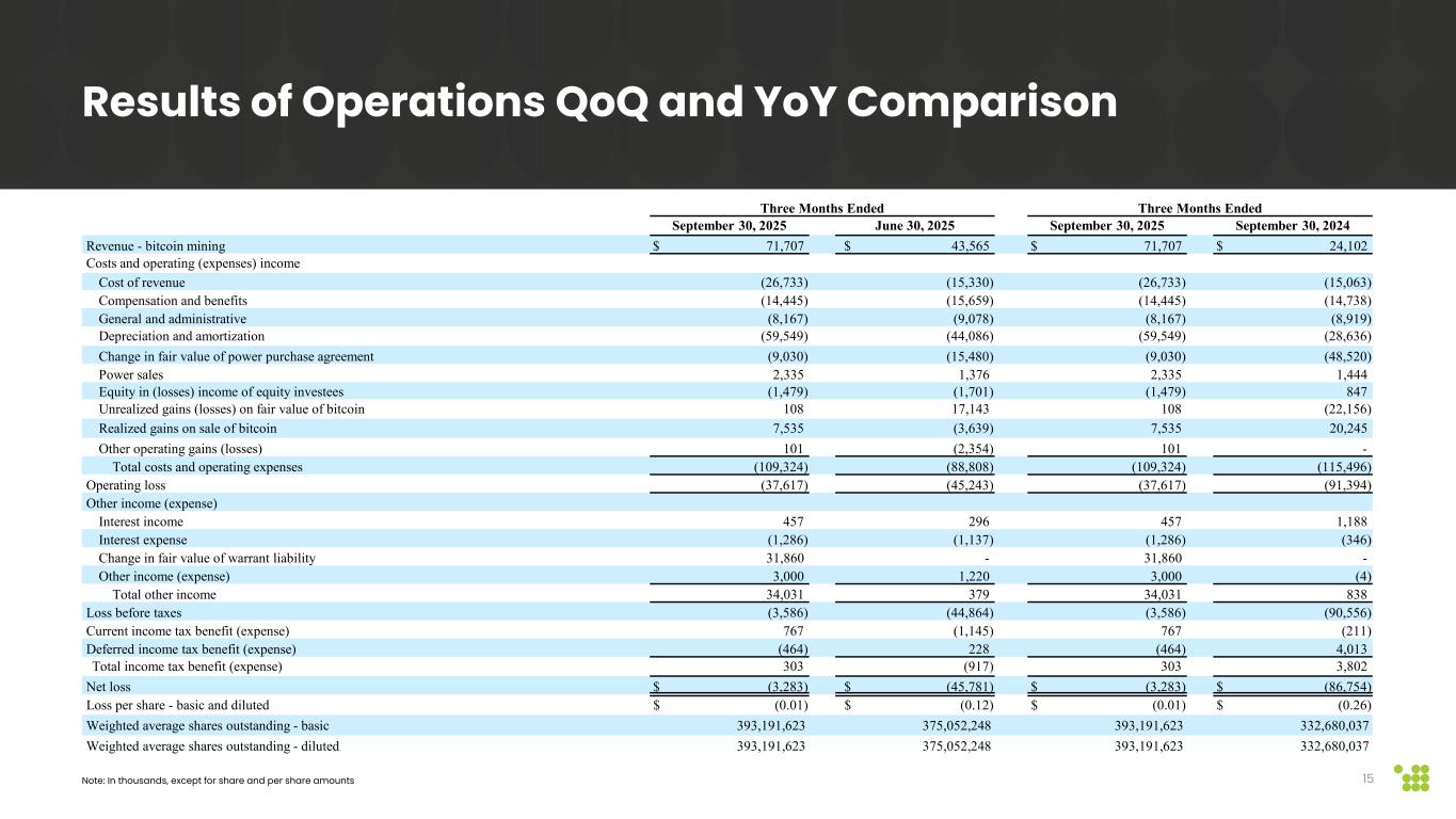 Three Months Ended Three Months Ended September 30, 2025 June 30, 2025 September 30, 2025 September 30, 2024 Revenue - bitcoin mining $ 71,707 $ 43,565 $ 71,707 $ 24,102 Costs and operating (expenses) income Cost of revenue (26,733) (15,330) (26,733) (15,063) Compensation and benefits (14,445) (15,659) (14,445) (14,738) General and administrative (8,167) (9,078) (8,167) (8,919) Depreciation and amortization (59,549) (44,086) (59,549) (28,636) Change in fair value of power purchase agreement (9,030) (15,480) (9,030) (48,520) Power sales 2,335 1,376 2,335 1,444 Equity in (losses) income of equity investees (1,479) (1,701) (1,479) 847 Unrealized gains (losses) on fair value of bitcoin 108 17,143 108 (22,156) Realized gains on sale of bitcoin 7,535 (3,639) 7,535 20,245 Other operating gains (losses) 101 (2,354) 101 - Total costs and operating expenses (109,324) (88,808) (109,324) (115,496) Operating loss (37,617) (45,243) (37,617) (91,394) Other income (expense) Interest income 457 296 457 1,188 Interest expense (1,286) (1,137) (1,286) (346) Change in fair value of warrant liability 31,860 - 31,860 - Other income (expense) 3,000 1,220 3,000 (4) Total other income 34,031 379 34,031 838 Loss before taxes (3,586) (44,864) (3,586) (90,556) Current income tax benefit (expense) 767 (1,145) 767 (211) Deferred income tax benefit (expense) (464) 228 (464) 4,013 Total income tax benefit (expense) 303 (917) 303 3,802 Net loss $ (3,283) $ (45,781) $ (3,283) $ (86,754) Loss per share - basic and diluted $ (0.01) $ (0.12) $ (0.01) $ (0.26) Weighted average shares outstanding - basic 393,191,623 375,052,248 393,191,623 332,680,037 Weighted average shares outstanding - diluted 393,191,623 375,052,248 393,191,623 332,680,037 Results of Operations QoQ and YoY Comparison 15Note: In thousands, except for share and per share amounts