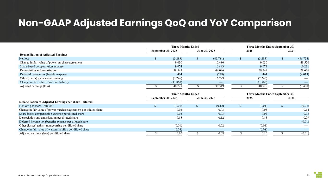 Three Months Ended Three Months Ended September 30, September 30, 2025 June 30, 2025 2025 2024 Reconciliation of Adjusted Earnings: Net loss $ (3,283) $ (45,781) $ (3,283) $ (86,754) Change in fair value of power purchase agreement 9,030 15,480 9,030 48,520 Share-based compensation expense 9,074 10,493 9,074 10,211 Depreciation and amortization 59,549 44,086 59,549 28,636 Deferred income tax (benefit) expense 464 (228) 464 (4,013) Other (losses) gains - nonrecurring (2,246) 6,299 (2,246) — Change in fair value of warrant liability (31,860) — (31,860) — Adjusted earnings (loss) $ 40,728 $ 30,349 $ 40,728 $ (3,400) Three Months Ended Three Months Ended September 30, September 30, 2025 June 30, 2025 2025 2024 Reconciliation of Adjusted Earnings per share - diluted: Net loss per share - diluted $ (0.01) $ (0.12) $ (0.01) $ (0.26) Change in fair value of power purchase agreement per diluted share 0.03 0.03 0.03 0.14 Share-based compensation expense per diluted share 0.02 0.03 0.02 0.03 Depreciation and amortization per diluted share 0.15 0.12 0.15 0.09 Deferred income tax (benefit) expense per diluted share — — — (0.01) Other (losses) gains - nonrecurring per diluted share (0.01) 0.02 (0.01) — Change in fair value of warrant liability per diluted share (0.08) — (0.08) — Adjusted earnings (loss) per diluted share $ 0.10 $ 0.08 $ 0.10 $ (0.01) Non-GAAP Adjusted Earnings QoQ and YoY Comparison 16Note: In thousands, except for per share amounts
