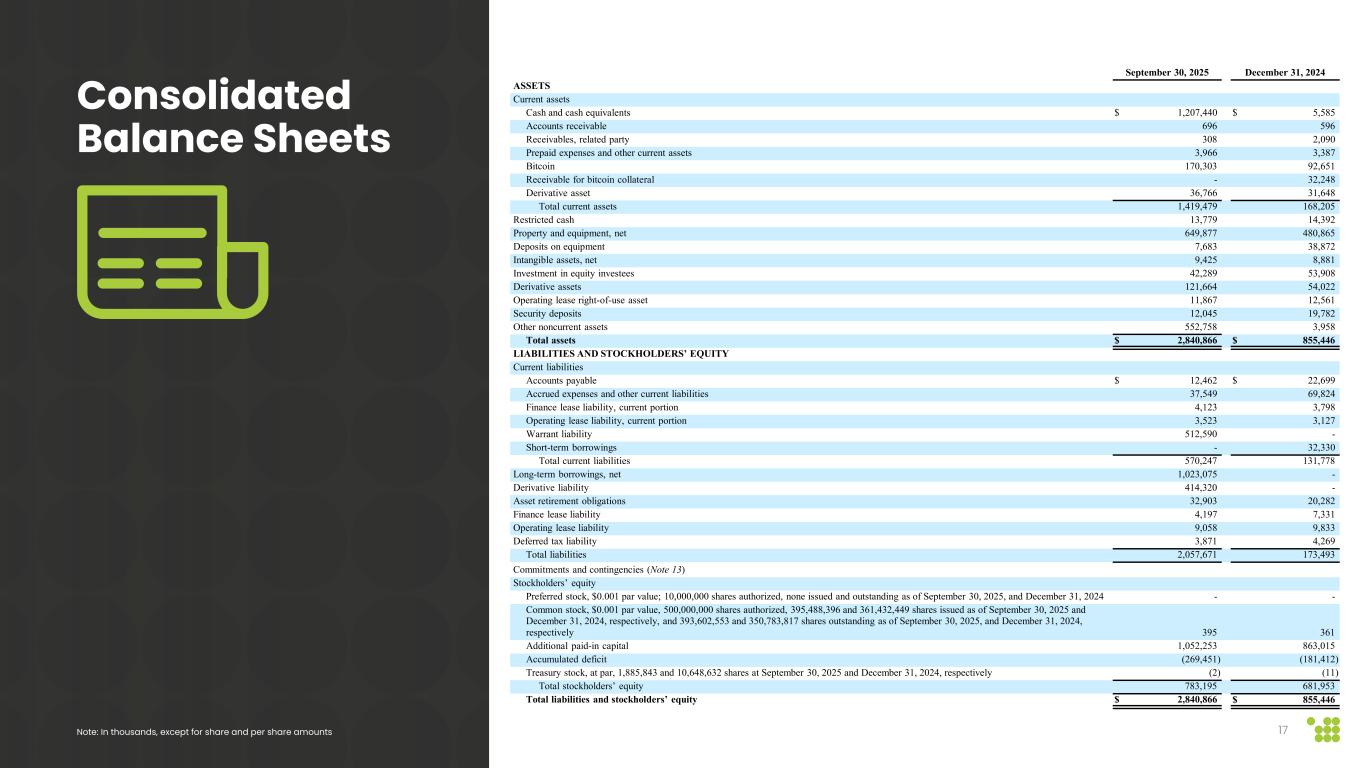 September 30, 2025 December 31, 2024 ASSETS Current assets Cash and cash equivalents $ 1,207,440 $ 5,585 Accounts receivable 696 596 Receivables, related party 308 2,090 Prepaid expenses and other current assets 3,966 3,387 Bitcoin 170,303 92,651 Receivable for bitcoin collateral - 32,248 Derivative asset 36,766 31,648 Total current assets 1,419,479 168,205 Restricted cash 13,779 14,392 Property and equipment, net 649,877 480,865 Deposits on equipment 7,683 38,872 Intangible assets, net 9,425 8,881 Investment in equity investees 42,289 53,908 Derivative assets 121,664 54,022 Operating lease right-of-use asset 11,867 12,561 Security deposits 12,045 19,782 Other noncurrent assets 552,758 3,958 Total assets $ 2,840,866 $ 855,446 LIABILITIES AND STOCKHOLDERS’ EQUITY Current liabilities Accounts payable $ 12,462 $ 22,699 Accrued expenses and other current liabilities 37,549 69,824 Finance lease liability, current portion 4,123 3,798 Operating lease liability, current portion 3,523 3,127 Warrant liability 512,590 - Short-term borrowings - 32,330 Total current liabilities 570,247 131,778 Long-term borrowings, net 1,023,075 - Derivative liability 414,320 - Asset retirement obligations 32,903 20,282 Finance lease liability 4,197 7,331 Operating lease liability 9,058 9,833 Deferred tax liability 3,871 4,269 Total liabilities 2,057,671 173,493 Commitments and contingencies (Note 13) Stockholders’ equity Preferred stock, $0.001 par value; 10,000,000 shares authorized, none issued and outstanding as of September 30, 2025, and December 31, 2024 - - Common stock, $0.001 par value, 500,000,000 shares authorized, 395,488,396 and 361,432,449 shares issued as of September 30, 2025 and December 31, 2024, respectively, and 393,602,553 and 350,783,817 shares outstanding as of September 30, 2025, and December 31, 2024, respectively 395 361 Additional paid-in capital 1,052,253 863,015 Accumulated deficit (269,451) (181,412) Treasury stock, at par, 1,885,843 and 10,648,632 shares at September 30, 2025 and December 31, 2024, respectively (2) (11) Total stockholders’ equity 783,195 681,953 Total liabilities and stockholders’ equity $ 2,840,866 $ 855,446 Consolidated Balance Sheets 17Note: In thousands, except for share and per share amounts