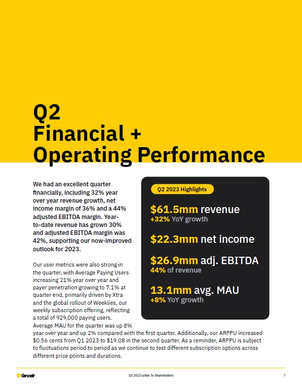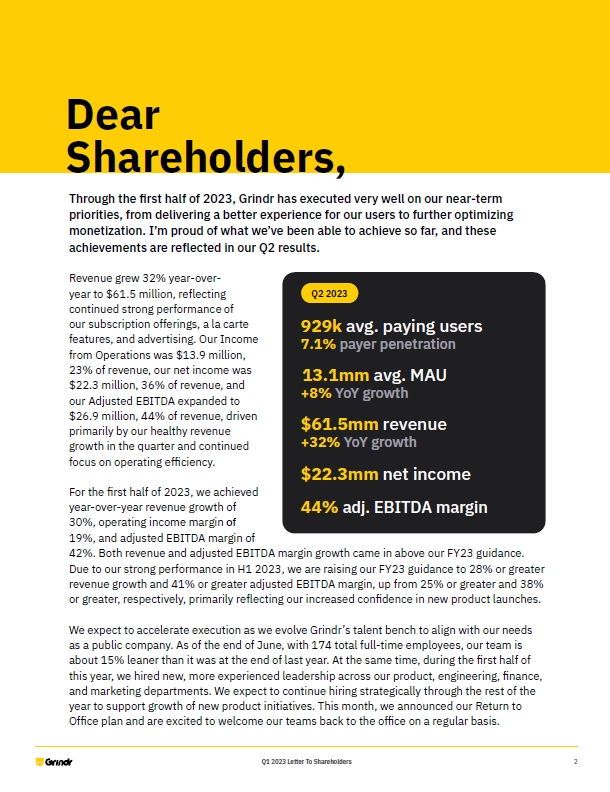 Through the first half of 2023, Grindr has executed very well on our near-term priorities, from delivering a better experience for our users to further optimizing monetization. I’m proud of what we’ve been able to achieve so far, and these achievements are reflected in our Q2 results.  Revenue grew 32% year-over- year to $61.5 million, reflecting continued strong performance of  our subscription offerings, a la carte features, and advertising. Our Income from Operations was $13.9 million, 23% of revenue, our net income was  $22.3 million, 36% of revenue, and our Adjusted EBITDA expanded to  $26.9 million, 44% of revenue, driven primarily by our healthy revenue growth in the quarter and continued focus on operating efficiency.  For the first half of 2023, we achieved year-over-year revenue growth of 30%, operating income margin of 19%, and adjusted EBITDA margin of  42%. Both revenue and adjusted EBITDA margin growth came in above our FY23 guidance. Due to our strong performance in H1 2023, we are raising our FY23 guidance to 28% or greater revenue growth and 41% or greater adjusted EBITDA margin, up from 25% or greater and 38% or greater, respectively, primarily reflecting our increased confidence in new product launches.  We expect to accelerate execution as we evolve Grindr’s talent bench to align with our needs as a public company. As of the end of June, with 174 total full-time employees, our team is about 15% leaner than it was at the end of last year. At the same time, during the first half of this year, we hired new, more experienced leadership across our product, engineering, finance, and marketing departments. We expect to continue hiring strategically through the rest of the year to support growth of new product initiatives. This month, we announced our Return to Office plan and are excited to welcome our teams back to the office on a regular basis.  Dear Shareholders,  929k avg. paying users  7.1% payer penetration  13.1mm avg. MAU  +8% YoY growth  $61.5mm revenue  +32% YoY growth  $22.3mm net income  44% adj. EBITDA margin  Q2 2023  Q1 2023 Letter To Shareholders  10