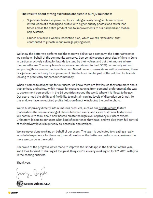 The results of our strong execution are clear in our Q2 launches:  Significant feature improvements, including a newly designed home screen; introduction of a redesigned profile with higher quality photos; and faster load times across the entire product due to improvements to our backend and mobile app systems.  Launch of a new 1 week subscription plan, which we call “Weeklies,” that contributed to growth in our average paying users.  We know the better we perform and the more we deliver as a company, the better advocates we can be on behalf of the community we serve. I personally spent a great deal of time in June in particular actively calling for brands to stand by their values and put their money where their mouths are. Too many brands espouse commitment to the LGBTQ community without  supporting those commitments with action. Based on our conversations with advertisers, there is significant opportunity for improvement. We think we can be part of the solution for brands looking to practically support our community.  When it comes to advocating for our users, we know there are few issues they care more about than privacy and safety, which matter for reasons ranging from personal preference all the way to government persecution in the 66 countries around the world where it is illegal to be gay.  Our users need the ability and flexibility to maintain varying levels of discretion on Grindr. To this end, we have no required profile fields on Grindr – including the profile photo.  We’ve built privacy directly into numerous products, such as our private album feature that enables the secure sharing of photos between users, and as we build new features we will continue to think about how best to create the high level of privacy our users expect.  Ultimately, it is up to our users what kind of experience they have, and we give them full control of their privacy levels in our easy-to-access in-app settings.  We are never done working on behalf of our users. The team is dedicated to creating a really wonderful experience for them and, overall, we know the better we perform as a business the more we can do in the world.  I’m proud of the progress we’ve made to improve the Grindr app in the first half of this year, and I look forward to sharing all the great things we’re already working on for H2 2023 with you in the coming quarters.  Thank you,  George Arison, CEO  Q1 2023 Letter To Shareholders  10