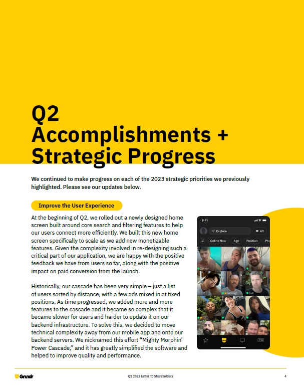Q2  Accomplishments + Strategic Progress  We continued to make progress on each of the 2023 strategic priorities we previously highlighted. Please see our updates below.  Improve the User Experience  At the beginning of Q2, we rolled out a newly designed home screen built around core search and filtering features to help our users connect more efficiently. We built this new home screen specifically to scale as we add new monetizable features. Given the complexity involved in re-designing such a critical part of our application, we are happy with the positive feedback we have from users so far, along with the positive impact on paid conversion from the launch.  Historically, our cascade has been very simple – just a list of users sorted by distance, with a few ads mixed in at fixed positions. As time progressed, we added more and more features to the cascade and it became so complex that it became slower for users and harder to update it on our backend infrastructure. To solve this, we decided to move  technical complexity away from our mobile app and onto our backend servers. We nicknamed this effort “Mighty Morphin’ Power Cascade,” and it has greatly simplified the software and helped to improve quality and performance.  Q1 2023 Letter To Shareholders  10