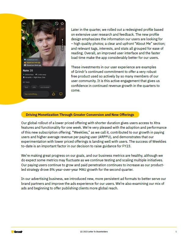 Later in the quarter, we rolled out a redesigned profile based on extensive user research and feedback. The new profile design emphasizes the information our users are looking for  – high quality photos; a clear and upfront “About Me” section; and relevant tags, interests, and stats all grouped for ease of reading. Overall, an improved user interface and the faster load time make the app considerably better for our users.  These investments in our user experience are examples of Grindr’s continued commitment to offer a very robust free product used so actively by so many members of our user community. It is this active engagement that gives us confidence in continued revenue growth in the quarters to come.  Driving Monetization Through Greater Conversion and New Offerings  Our global rollout of a lower priced offering with shorter duration gives users access to Xtra features and functionality for one week. We’re very pleased with the adoption and performance of this new subscription offering. “Weeklies,” as we call it, contributed to our growth in paying users and higher average revenue per paying user (ARPPU), and demonstrates that our experimentation with lower priced offerings is landing well with users. The success of Weeklies to-date is an important factor in our decision to raise guidance for FY23.  We’re making great progress on our goals, and our business metrics are healthy, although we do expect some metrics may fluctuate as we continue testing and scaling multiple initiatives. Our paying users continue to grow and paid penetration continues to increase as our product- led strategy drove 8% year-over-year MAU growth for the second quarter.  In our advertising business, we introduced new, more persistent ad formats to better serve our brand partners and improve the ads experience for our users. We’re also examining our mix of ads and beginning to offer publishing clients more global reach.  Q1 2023 Letter To Shareholders  10