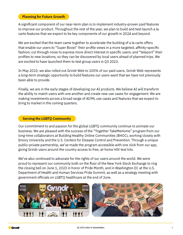 Serving the LGBTQ Community  Our commitment to and passion for the global LGBTQ community continue to animate our business. We are pleased with the success of the “Together TakeMeHome” program from our long-time collaborators at Building Healthy Online Communities (BHOC), working closely with Emory University and the U.S. Centers for Disease Control and Prevention. Through a unique public-private partnership, we’ve made the program accessible with one click from our app, giving Grindr users around the country access to free, at-home HIV test kits.  We’ve also continued to advocate for the rights of our users around the world. We were proud to represent our community both on the floor of the New York Stock Exchange to ring the closing bell on June 1, 2023 in honor of Pride Month, and in Washington DC at the U.S. Department of Health and Human Services Pride Summit, as well as a strategy meeting with government officials on LGBTQ healthcare at the end of June.  Planning for Future Growth  A significant component of our near-term plan is to implement industry-proven paid features to improve our product. Throughout the rest of the year, we plan to build and test-launch a la carte features that we expect to be key components of our growth in 2024 and beyond.  We are excited that the team came together to accelerate the building of a la carte offers that enable our users to “Super Boost” their profile views in a more targeted, affinity-specific  fashion; cut through noise to express more direct interest in specific users; and “teleport” their profiles to new locations, so they can be discovered by local users ahead of planned trips. We are excited to have launched them to test group users in Q3 2023.  In May 2023, we also rolled out Grindr Web to 100% of our paid users. Grindr Web represents a long-term strategic opportunity to build features our users want that we have not previously been able to provide.  Finally, we are in the early stages of developing our AI products. We believe AI will transform the ability to match users with one another and create new use cases for engagement. We are making investments across a broad range of AI/ML use cases and features that we expect to bring to market in the coming quarters.  Q1 2023 Letter To Shareholders  10