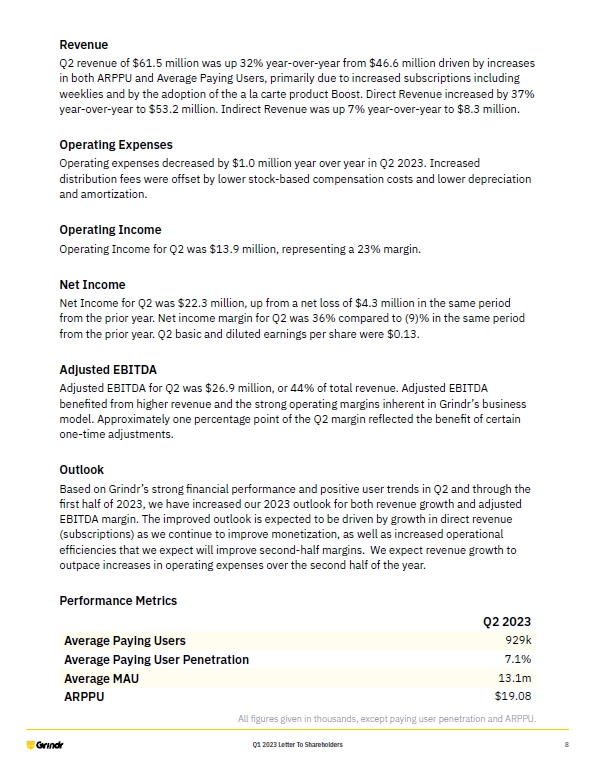 Revenue  Q2 revenue of $61.5 million was up 32% year-over-year from $46.6 million driven by increases in both ARPPU and Average Paying Users, primarily due to increased subscriptions including weeklies and by the adoption of the a la carte product Boost. Direct Revenue increased by 37% year-over-year to $53.2 million. Indirect Revenue was up 7% year-over-year to $8.3 million.  Operating Expenses  Operating expenses decreased by $1.0 million year over year in Q2 2023. Increased distribution fees were offset by lower stock-based compensation costs and lower depreciation and amortization.  Operating Income  Operating Income for Q2 was $13.9 million, representing a 23% margin.  Net Income  Net Income for Q2 was $22.3 million, up from a net loss of $4.3 million in the same period from the prior year. Net income margin for Q2 was 36% compared to (9)% in the same period from the prior year. Q2 basic and diluted earnings per share were $0.13.  Adjusted EBITDA  Adjusted EBITDA for Q2 was $26.9 million, or 44% of total revenue. Adjusted EBITDA benefited from higher revenue and the strong operating margins inherent in Grindr’s business model. Approximately one percentage point of the Q2 margin reflected the benefit of certain one-time adjustments.  Outlook  Based on Grindr’s strong financial performance and positive user trends in Q2 and through the first half of 2023, we have increased our 2023 outlook for both revenue growth and adjusted EBITDA margin. The improved outlook is expected to be driven by growth in direct revenue (subscriptions) as we continue to improve monetization, as well as increased operational efficiencies that we expect will improve second-half margins. We expect revenue growth to outpace increases in operating expenses over the second half of the year.  Performance Metrics  Q2 2023  Q1 2023 Letter To Shareholders  10  Average Paying Users  929k  Average Paying User Penetration  7.1%  Average MAU  13.1m  ARPPU  $19.08  All figures given in thousands, except paying user penetration and ARPPU.