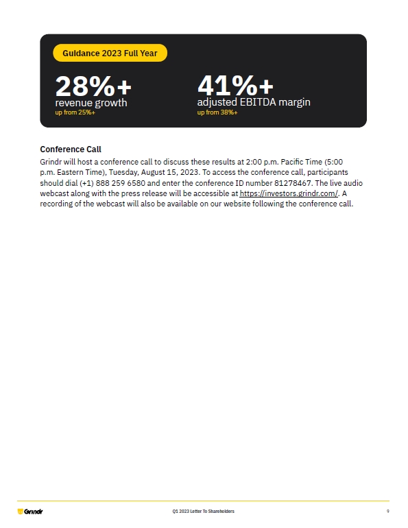 Conference Call  Grindr will host a conference call to discuss these results at 2:00 p.m. Pacific Time (5:00  p.m. Eastern Time), Tuesday, August 15, 2023. To access the conference call, participants should dial (+1) 888 259 6580 and enter the conference ID number 81278467. The live audio webcast along with the press release will be accessible at https://investors.grindr.com/. A recording of the webcast will also be available on our website following the conference call.  Guidance 2023 Full Year  Q1 2023 Letter To Shareholders  10  28%+  revenue growth  up from 25%+  41%+  adjusted EBITDA margin  up from 38%+