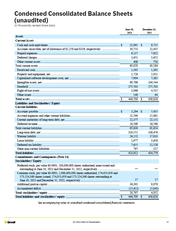 Condensed Consolidated Balance Sheets (unaudited)  (in thousands, except share data)  June 30,  2023  December 31,  2022  Assets  Current Assets  Cash and cash equivalents .......................................................................................... $  22,091  $ 8,725  Accounts receivable, net of allowance of $1,258 and $336, respectively ......................  30,753  22,435  Prepaid expenses .......................................................................................................  6,117  7,622  Deferred charges .......................................................................................................  3,651  3,652  Other current assets ...................................................................................................  408  750  Total current assets ......................................................................................................  63,020  43,184  Restricted cash ..........................................................................................................  1,392  1,392  Property and equipment, net .......................................................................................  1,728  2,021  Capitalized software development costs, net ................................................................  7,994  7,385  Intangible assets, net..................................................................................................  90,766  104,544  Goodwill ..................................................................................................................  275,703  275,703  Right-of-use assets ....................................................................................................  3,966  4,535  Other assets ..............................................................................................................  140  64  Total assets................................................................................................................. $  444,709  $ 438,828  Liabilities and Stockholders’ Equity  Current liabilities  Accounts payable ...................................................................................................... $  3,294  $ 5,435  Accrued expenses and other current liabilities..............................................................  21,590  15,681  Current maturities of long-term debt, net .....................................................................  22,377  22,152  Deferred revenue.......................................................................................................  18,569  18,586  Total current liabilities .................................................................................................  65,830  61,854  Long-term debt, net ...................................................................................................  320,551  338,476  Warrant liability ........................................................................................................  26,152  17,933  Lease liability ...........................................................................................................  2,977  3,658  Deferred tax liability..................................................................................................  7,615  12,528  Other non-current liabilities .......................................................................................  787  327  Total liabilities ...........................................................................................................  423,912  434,776  Commitments and Contingencies (Note 14)  Stockholders’ Equity  Preferred stock, par value $0.0001; 100,000,000 shares authorized; none issued and outstanding at June 30, 2023 and December 31, 2022, respectively ............................  —  —  Common stock, par value $0.0001; 1,000,000,000 shares authorized; 174,053,659 and 173,524,360 shares issued; 174,053,659 and 173,524,360 shares outstanding at  June 30, 2023 and December 31, 2022, respectively .................................................  17  17  Additional paid-in capital...........................................................................................  36,391  9,078  Accumulated deficit...................................................................................................  (15,611)  (5,043)  Total stockholders’ equity ..........................................................................................  20,797  4,052  Total liabilities and stockholders’ equity .................................................................... $  444,709  $ 438,828  Q1 2023 Letter To Shareholders  10  See accompanying notes to unaudited condensed consolidated financial statements.