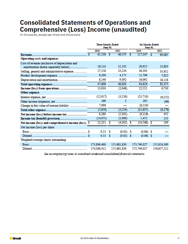 Consolidated Statements of Operations and Comprehensive (Loss) Income (unaudited)  (in thousands, except per share and share data)  Three Months Ended June 30,  Six Months Ended June 30,  2023  2022  2023  2022  Revenue ................................................................... $  61,538  $ 46,555  $ 117,347  $ 90,085  Operating costs and expenses  Cost of revenue (exclusive of depreciation and  amortization shown separately below)......................  16,110  12,102  30,925  23,803  Selling, general and administrative expense .................  17,158  23,234  36,103  33,612  Product development expense.....................................  6,200  4,175  11,706  7,822  Depreciation and amortization ....................................  8,140  9,092  16,092  18,118  Total operating expenses ..........................................  47,608  48,603  94,826  83,355  Income (loss) from operations ..................................  13,930  (2,048)  22,521  6,730  Other expense  Interest expense, net ..................................................  (12,917)  (3,256)  (23,710)  (6,212)  Other income (expense), net .......................................  169  2  292  (66)  Change in fair value of warrant liability.......................  7,098  —  (8,219)  —  Total other expense ..................................................  (5,650)  (3,254)  (31,637)  (6,278)  Net income (loss) before income tax .........................  8,280  (5,302)  (9,116)  452  Income tax (benefit) provision..................................  (14,051)  (1,000)  1,452  253  Net income (loss) and comprehensive income (loss) .. $  22,331  $ (4,302)  $ (10,568)  $ 199  Net income (loss) per share:  Basic ...................................................................... $  0.13  $ (0.03)  $ (0.06)  $ —  Diluted ................................................................... $  0.13  $ (0.03)  $ (0.06)  $ —  Weighted-average shares outstanding:  Basic ...................................................................... 173,896,490  155,681,830  173,749,027  155,624,369  Diluted ................................................................... 174,380,412  155,681,830  173,749,027  156,657,212  Q1 2023 Letter To Shareholders  10  See accompanying notes to unaudited condensed consolidated financial statements.