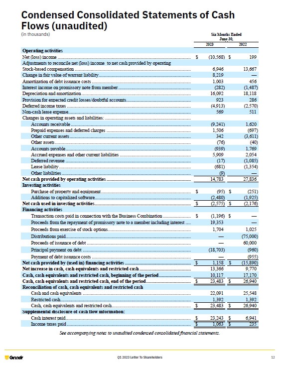 Condensed Consolidated Statements of Cash Flows (unaudited)  (in thousands)  Six Months Ended June 30,  2023  2022  Operating activities  Net (loss) income .....................................................................................................  $ (10,568)  $ 199  Adjustments to reconcile net (loss) income to net cash provided by operating  Stock-based compensation ........................................................................................  6,946  13,667  Change in fair value of warrant liability......................................................................  8,219  —  Amortization of debt issuance costs ...........................................................................  1,003  456  Interest income on promissory note from member .......................................................  (282)  (1,487)  Depreciation and amortization ...................................................................................  16,092  18,118  Provision for expected credit losses/doubtful accounts.................................................  923  286  Deferred income taxes ..............................................................................................  (4,913)  (2,570)  Non-cash lease expense.............................................................................................  569  511  Changes in operating assets and liabilities: .................................................................  Accounts receivable ...........................................................................................  (9,241)  1,620  Prepaid expenses and deferred charges ................................................................  1,506  (697)  Other current assets............................................................................................  342  (3,611)  Other assets .......................................................................................................  (76)  (40)  Accounts payable ...............................................................................................  (939)  1,769  Accrued expenses and other current liabilities ......................................................  5,909  2,054  Deferred revenue ...............................................................................................  (17)  (1,085)  Lease liability ....................................................................................................  (681)  (1,354)  Other liabilities ..................................................................................................   (9)  —  Net cash provided by operating activities ................................................................  14,783  27,836  Investing activities  Purchase of property and equipment ....................................................................  $ (95)  $ (251)  Additions to capitalized software.........................................................................   (2,480)  (1,925)  Net cash used in investing activities.........................................................................  $ (2,575)  $ (2,176)  Financing activities  Transaction costs paid in connection with the Business Combination .....................  $ (1,196)  $ —  Proceeds from the repayment of promissory note to a member including interest ....  19,353  —  Proceeds from exercise of stock options...............................................................  1,704  1,025  Distributions paid...............................................................................................  —  (75,000)  Proceeds of issuance of debt ...............................................................................  —  60,000  Principal payment on debt ..................................................................................  (18,703)  (960)  Payment of debt issuance costs ...........................................................................   —    (955)  Net cash provided by (used in) financing activities ..................................................   $ 1,158   $ (15,890)  Net increase in cash, cash equivalents and restricted cash .......................................  13,366  9,770  Cash, cash equivalents and restricted cash, beginning of the period ........................   10,117   17,170  Cash, cash equivalents and restricted cash, end of the period ..................................   $ 23,483    $ 26,940   Reconciliation of cash, cash equivalents and restricted cash  Cash and cash equivalents ..................................................................................  22,091  25,548  Restricted cash...................................................................................................   1,392   1,392  Cash, cash equivalents and restricted cash............................................................   $ 23,483    $ 26,940   Supplemental disclosure of cash flow information:  Cash interest paid...............................................................................................  $ 23,243  $ 6,941  Income taxes paid ..............................................................................................  $ 1,063  $ 235  See accompanying notes to unaudited condensed consolidated financial statements.  Q1 2023 Letter To Shareholders  10