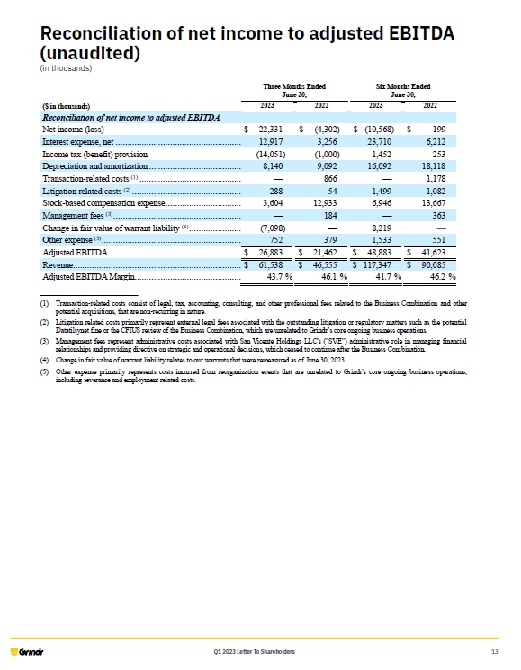 Three Months Ended June 30,  Six Months Ended June 30,  ($ in thousands)  2023  2022  2023  2022  Reconciliation of net income to adjusted EBITDA  Net income (loss) $  22,331  $ (4,302)  $ (10,568)  $ 199  Interest expense, net .....................................................  12,917  3,256  23,710  6,212  Income tax (benefit) provision  (14,051)  (1,000)  1,452  253  Depreciation and amortization .......................................  8,140  9,092  16,092  18,118  Transaction-related costs (1) ...........................................  —  866  —  1,178  Litigation related costs (2) ..............................................  288  54  1,499  1,082  Stock-based compensation expense................................  3,604  12,933  6,946  13,667  Management fees (3) ......................................................  —  184  —  363  Change in fair value of warrant liability (4) ......................  (7,098)  —  8,219  —  Other expense (5)...........................................................  752  379  1,533  551  Adjusted EBITDA ....................................................... $  26,883  $ 21,462  $ 48,883  $ 41,623  Revenue.......................................................................  $ 61,538  $ 46,555  $ 117,347  $ 90,085  Adjusted EBITDA Margin.............................................  43.7 %  46.1 %  41.7 %  46.2 %  Transaction-related costs consist of legal, tax, accounting, consulting, and other professional fees related to the Business Combination and other potential acquisitions, that are non-recurring in nature.  Litigation related costs primarily represent external legal fees associated with the outstanding litigation or regulatory matters such as the potential Datatilsynet fine or the CFIUS review of the Business Combination, which are unrelated to Grindr’s core ongoing business operations.  Management fees represent administrative costs associated with San Vicente Holdings LLC's ("SVE") administrative role in managing financial relationships and providing directive on strategic and operational decisions, which ceased to continue after the Business Combination.  Change in fair value of warrant liability relates to our warrants that were remeasured as of June 30, 2023.  Other expense primarily represents costs incurred from reorganization events that are unrelated to Grindr's core ongoing business operations, including severance and employment related costs.  Q1 2023 Letter To Shareholders  10  Reconciliation of net income to adjusted EBITDA (unaudited)  (in thousands)