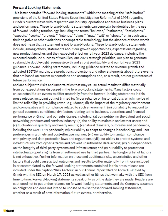 Forward Looking Statements  This letter contains “forward looking statements” within the meaning of the “safe harbor” provisions of the United States Private Securities Litigation Reform Act of 1995 regarding Grindr’s current views with respect to our industry, operations and future business plans and performance. These forward-looking statements can generally be identified by the use of forward-looking terminology, including the terms “believes,” “estimates,” “anticipates,” “expects,” “seeks,” “projects,” “intends,” “plans,” “may,” “will” or “should” or, in each case,  their negative or other variations or comparable terminology, but the absence of these words does not mean that a statement is not forward-looking. These forward-looking statements include, among others, statements about our growth opportunities, expectations regarding new product launches and their expected effect on full year 2023 guidance, including the expected continued success of Weeklies, our 2023 strategic priorities, our plan to generate sustainable double-digit revenue growth and strong profitability and our full year 2023 guidance. Forward-looking statements, including guidance related to revenue growth and adjusted EBITDA margin, are predictions, projections and other statements about future events that are based on current expectations and assumptions and, as a result, are not guarantees of future performance  and are subject to risks and uncertainties that may cause actual results to differ materially from our expectations discussed in the forward-looking statements. Many factors could cause actual future events to differ materially from the forward-looking statements in this press release, including but not limited to: (i) our reliance on historical data, which may be of limited reliability, in providing revenue guidance; (ii) the impact of the regulatory environment and complexities with compliance related to such environment; (iii) our ability to respond to general economic conditions; (iv) factors relating to the business, operations and financial performance of Grindr and our subsidiaries, including: (a) competition in the dating and social networking products and services industry; (b) the ability to maintain and attract users; and  (c) fluctuation in quarterly and yearly results; (v) natural disasters, outbreaks and pandemics, including the COVID-19 pandemic; (vi) our ability to adapt to changes in technology and user preferences in a timely and cost-effective manner; (vii) our ability to maintain compliance with privacy and data protection laws and regulations; (viii) our ability to protect systems and  infrastructures from cyber-attacks and prevent unauthorized data access; (ix) our dependence on the integrity of third-party systems and infrastructure; and (x) our ability to protect our intellectual property rights from unauthorized use by third parties. The foregoing list of factors is not exhaustive. Further information on these and additional risks, uncertainties and other factors that could cause actual outcomes and results to differ materially from those included in or contemplated by the forward-looking statements contained in this press release are included under the caption “Risk Factors” in our Annual Report filed on Form 10-K filed by Grindr with the SEC on March 17, 2023 as well as other filings that we make with the SEC from  time to time. Forward-looking statements speak only as of the date they are made. Readers are cautioned not to put undue reliance on forward-looking statements, and the Company assumes no obligation and does not intend to update or revise these forward-looking statements, whether as a result of new information, future events, or otherwise.  Q1 2023 Letter To Shareholders  10