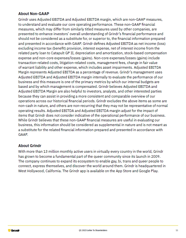 About Non-GAAP  Grindr uses Adjusted EBITDA and Adjusted EBITDA margin, which are non-GAAP measures, to understand and evaluate our core operating performance. These non-GAAP financial measures, which may differ from similarly titled measures used by other companies, are presented to enhance investors’ overall understanding of Grindr’s financial performance and should not be considered as a substitute for, or superior to, the financial information prepared and presented in accordance with GAAP. Grindr defines Adjusted EBITDA as net income (loss) excluding income tax (benefit) provision, interest expense, net of interest income from the  related party loan to Catapult GP II, depreciation and amortization, stock-based compensation expense and non-core expenses/losses (gains). Non-core expenses/losses (gains) include transaction-related costs, litigation-related costs, management fees, change in fair value  of warrant liability and other expense, which includes asset impairments. Adjusted EBITDA Margin represents Adjusted EBITDA as a percentage of revenue. Grindr’s management uses Adjusted EBITDA and Adjusted EBITDA margin internally to evaluate the performance of our business and this measure is one of the primary metrics by which our internal budgets are based and by which management is compensated. Grindr believes Adjusted EBITDA and Adjusted EBITDA Margin are also helpful to investors, analysts, and other interested parties because they can assist in providing a more consistent and comparable overview of our operations across our historical financial periods. Grindr excludes the above items as some are non-cash in nature, and others are non-recurring that they may not be representative of normal operating results. Adjusted EBITDA and Adjusted EBITDA margin adjust for the impact of  items that Grindr does not consider indicative of the operational performance of our business. While Grindr believes that these non-GAAP financial measures are useful in evaluating our business, this information should be considered as supplemental in nature and is not meant as a substitute for the related financial information prepared and presented in accordance with GAAP.  About Grindr  With more than 13 million monthly active users in virtually every country in the world, Grindr has grown to become a fundamental part of the queer community since its launch in 2009. The company continues to expand its ecosystem to enable gay, bi, trans and queer people to connect, express themselves, and discover the world around them. Grindr is headquartered in West Hollywood, California. The Grindr app is available on the App Store and Google Play.  Q1 2023 Letter To Shareholders  10