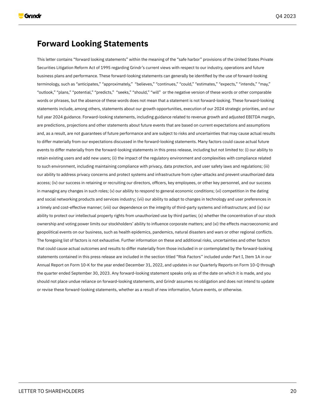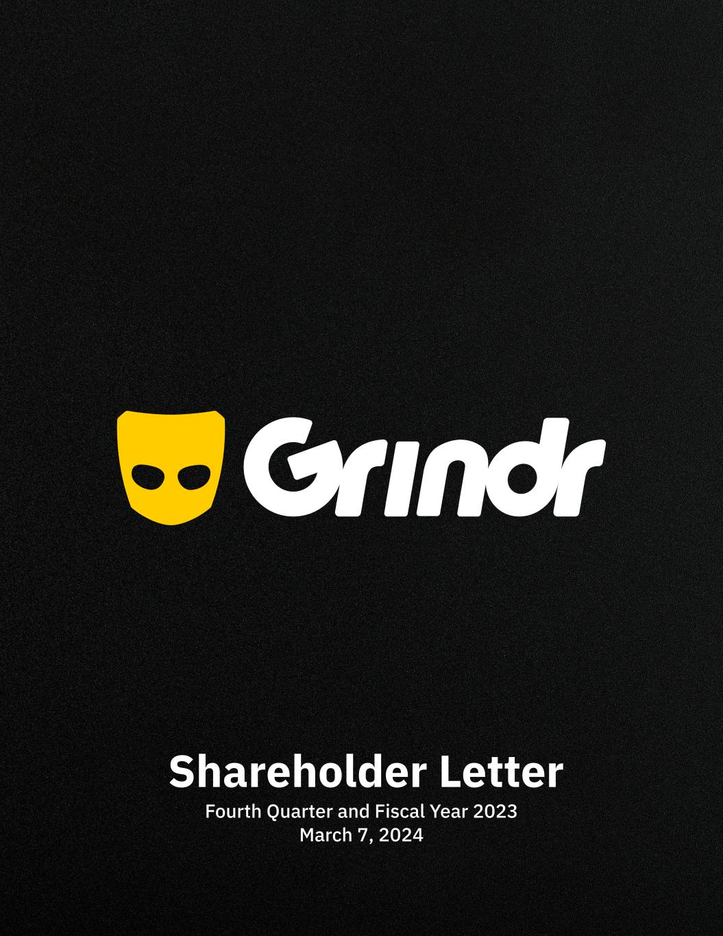20LETTER TO SHAREHOLDERS Q4 2023 Forward Looking Statements This letter contains “forward looking statements” within the meaning of the “safe harbor” provisions of the United States Private Securities Litigation Reform Act of 1995 regarding Grindr’s current views with respect to our industry, operations and future business plans and performance. These forward-looking statements can generally be identified by the use of forward-looking terminology, such as “anticipates,” “approximately,” “believes,” “continues,” “could,” “estimates,” “expects,” “intends,” “may,” “outlook,” “plans,” “potential,” “predicts,” “seeks,” “should,” “will” or the negative version of these words or other comparable words or phrases, but the absence of these words does not mean that a statement is not forward-looking. These forward-looking statements include, among others, statements about our growth opportunities, execution of our 2024 strategic priorities, and our full year 2024 guidance. Forward-looking statements, including guidance related to revenue growth and adjusted EBITDA margin, are predictions, projections and other statements about future events that are based on current expectations and assumptions and, as a result, are not guarantees of future performance and are subject to risks and uncertainties that may cause actual results to differ materially from our expectations discussed in the forward-looking statements. Many factors could cause actual future events to differ materially from the forward-looking statements in this press release, including but not limited to: (i) our ability to retain existing users and add new users; (ii) the impact of the regulatory environment and complexities with compliance related to such environment, including maintaining compliance with privacy, data protection, and user safety laws and regulations; (iii) our ability to address privacy concerns and protect systems and infrastructure from cyber-attacks and prevent unauthorized data access; (iv) our success in retaining or recruiting our directors, officers, key employees, or other key personnel, and our success in managing any changes in such roles; (v) our ability to respond to general economic conditions; (vi) competition in the dating and social networking products and services industry; (vii) our ability to adapt to changes in technology and user preferences in a timely and cost-effective manner; (viii) our dependence on the integrity of third-party systems and infrastructure; and (ix) our ability to protect our intellectual property rights from unauthorized use by third parties; (x) whether the concentration of our stock ownership and voting power limits our stockholders’ ability to influence corporate matters; and (xi) the effects macroeconomic and geopolitical events on our business, such as health epidemics, pandemics, natural disasters and wars or other regional conflicts. The foregoing list of factors is not exhaustive. Further information on these and additional risks, uncertainties and other factors that could cause actual outcomes and results to differ materially from those included in or contemplated by the forward-looking statements contained in this press release are included in the section titled “Risk Factors’’ included under Part I, Item 1A in our Annual Report on Form 10-K for the year ended December 31, 2022, and updates in our Quarterly Reports on Form 10-Q through the quarter ended September 30, 2023. Any forward-looking statement speaks only as of the date on which it is made, and you should not place undue reliance on forward-looking statements, and Grindr assumes no obligation and does not intend to update or revise these forward-looking statements, whether as a result of new information, future events, or otherwise.
