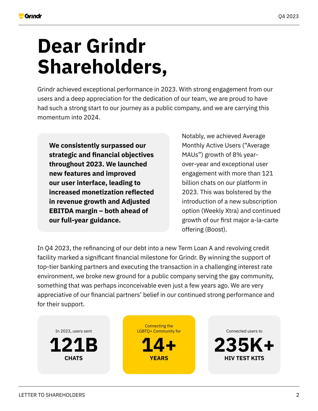 2LETTER TO SHAREHOLDERS Q4 2023 Grindr achieved exceptional performance in 2023. With strong engagement from our users and a deep appreciation for the dedication of our team, we are proud to have had such a strong start to our journey as a public company, and we are carrying this momentum into 2024. Notably, we achieved Average Monthly Active Users (“Average MAUs”) growth of 8% year- over-year and exceptional user engagement with more than 121 billion chats on our platform in 2023. This was bolstered by the introduction of a new subscription option (Weekly Xtra) and continued growth of our first major a-la-carte offering (Boost). In Q4 2023, the refinancing of our debt into a new Term Loan A and revolving credit facility marked a significant financial milestone for Grindr. By winning the support of top-tier banking partners and executing the transaction in a challenging interest rate environment, we broke new ground for a public company serving the gay community, something that was perhaps inconceivable even just a few years ago. We are very appreciative of our financial partners’ belief in our continued strong performance and for their support. Dear Grindr Shareholders, 235K+ HIV TEST KITS Connected users to 14+ YEARS Connecting the LGBTQ+ Community for 121B CHATS In 2023, users sent We consistently surpassed our strategic and financial objectives throughout 2023. We launched new features and improved our user interface, leading to increased monetization reflected in revenue growth and Adjusted EBITDA margin – both ahead of our full-year guidance.