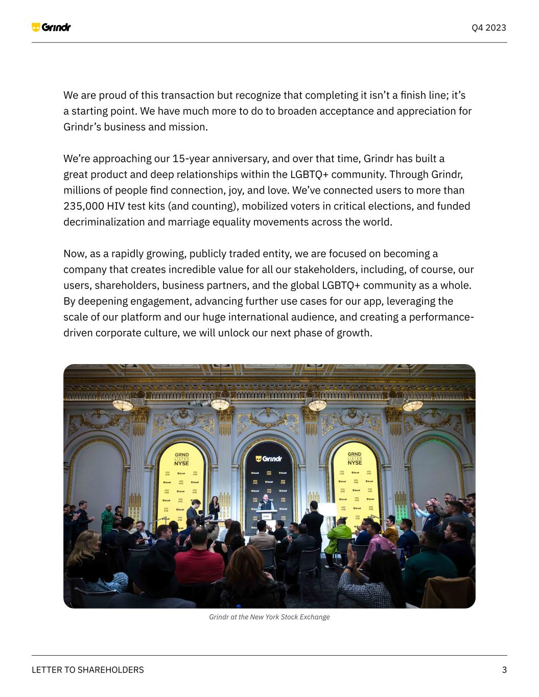 3LETTER TO SHAREHOLDERS Q4 2023 We are proud of this transaction but recognize that completing it isn’t a finish line; it’s a starting point. We have much more to do to broaden acceptance and appreciation for Grindr’s business and mission. We’re approaching our 15-year anniversary, and over that time, Grindr has built a great product and deep relationships within the LGBTQ+ community. Through Grindr, millions of people find connection, joy, and love. We’ve connected users to more than 235,000 HIV test kits (and counting), mobilized voters in critical elections, and funded decriminalization and marriage equality movements across the world. Now, as a rapidly growing, publicly traded entity, we are focused on becoming a company that creates incredible value for all our stakeholders, including, of course, our users, shareholders, business partners, and the global LGBTQ+ community as a whole. By deepening engagement, advancing further use cases for our app, leveraging the scale of our platform and our huge international audience, and creating a performance- driven corporate culture, we will unlock our next phase of growth. Grindr at the New York Stock Exchange