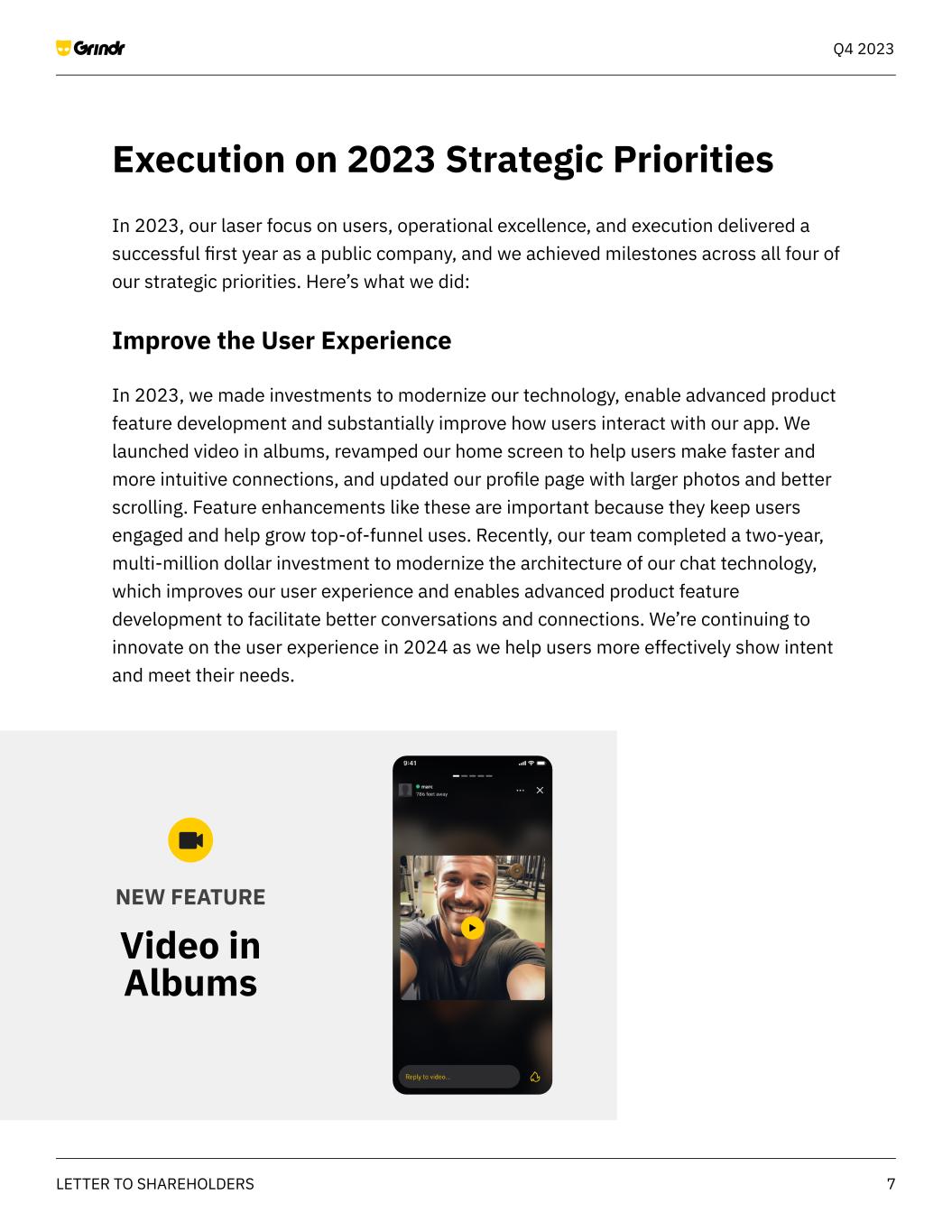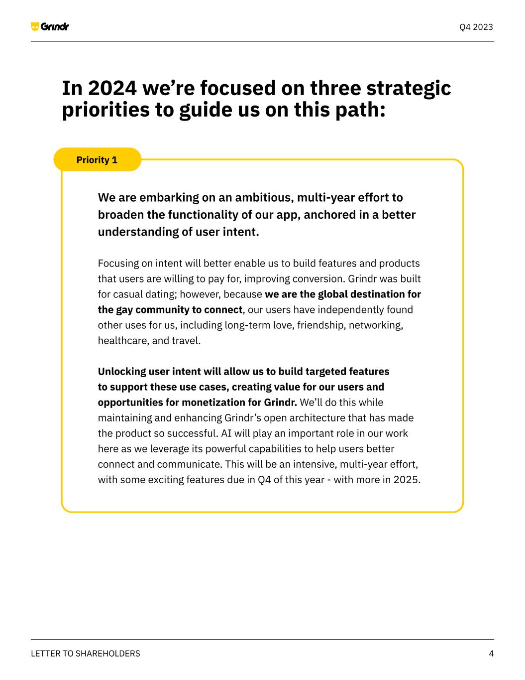 4LETTER TO SHAREHOLDERS Q4 2023 In 2024 we’re focused on three strategic priorities to guide us on this path: We are embarking on an ambitious, multi-year effort to broaden the functionality of our app, anchored in a better understanding of user intent. Focusing on intent will better enable us to build features and products that users are willing to pay for, improving conversion. Grindr was built for casual dating; however, because we are the global destination for the gay community to connect, our users have independently found other uses for us, including long-term love, friendship, networking, healthcare, and travel. Unlocking user intent will allow us to build targeted features to support these use cases, creating value for our users and opportunities for monetization for Grindr. We’ll do this while maintaining and enhancing Grindr’s open architecture that has made the product so successful. AI will play an important role in our work here as we leverage its powerful capabilities to help users better connect and communicate. This will be an intensive, multi-year effort, with some exciting features due in Q4 of this year - with more in 2025. Priority 1