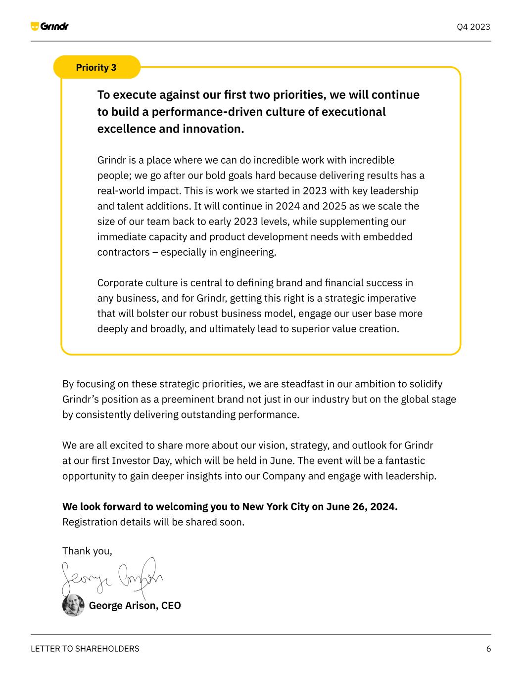 6LETTER TO SHAREHOLDERS Q4 2023 By focusing on these strategic priorities, we are steadfast in our ambition to solidify Grindr’s position as a preeminent brand not just in our industry but on the global stage by consistently delivering outstanding performance. We are all excited to share more about our vision, strategy, and outlook for Grindr at our first Investor Day, which will be held in June. The event will be a fantastic opportunity to gain deeper insights into our Company and engage with leadership. We look forward to welcoming you to New York City on June 26, 2024. Registration details will be shared soon. Thank you, George Arison, CEO To execute against our first two priorities, we will continue to build a performance-driven culture of executional excellence and innovation. Grindr is a place where we can do incredible work with incredible people; we go after our bold goals hard because delivering results has a real-world impact. This is work we started in 2023 with key leadership and talent additions. It will continue in 2024 and 2025 as we scale the size of our team back to early 2023 levels, while supplementing our immediate capacity and product development needs with embedded contractors – especially in engineering. Corporate culture is central to defining brand and financial success in any business, and for Grindr, getting this right is a strategic imperative that will bolster our robust business model, engage our user base more deeply and broadly, and ultimately lead to superior value creation. Priority 3